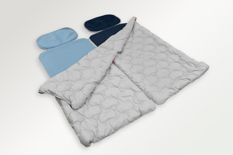 通常の寝袋とは違い、少し硬めの通気性のよい敷布団パート、イシケン株式会社の新世代の人工羽毛綿「Air Flake(R)」を使った掛け布団パート、本体を収納すればクッションになり衣類などを詰めて枕にも出来るピローパートから成り立つ一体型寝具です。(実用新案登録第3239767号 ファスナー付き収納袋一体型の就寝用マット)