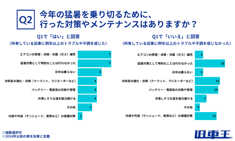 一方でトラブルがなかったと答えた方(Q1で「いいえ」)は、「猛暑対策として特別なことは行わなかった」(18件)が最多。次いで「冷却系の強化」(15件)、「バッテリー・電装系の交換や管理」(14件)、「内装や外装の保護対策」(13件)と、バランス良くメンテナンスが行われています。