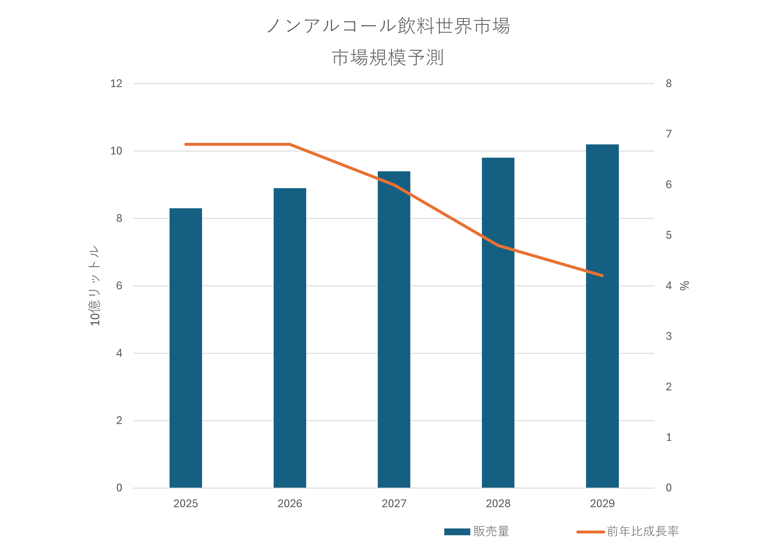 アルコール飲料全体の成長率は低迷している一方で、ノンアルコール飲料市場は急成長しています。例えば、ノンアルコールスピリッツの販売量は前年比17%増、ノンアルコールRTDの販売量は前年比14%増、ノン/低アルコールビールの販売量は前年比11%増、ノンアルコールワインの販売量は前年比7%増と、いずれもアルコール飲料を大きく上回る成長率を記録しています。ノンアルコール飲料の世界市場*は、2025年から2029年の間に総量で24%成長し、2029年には102億リットルを超える見込みです。