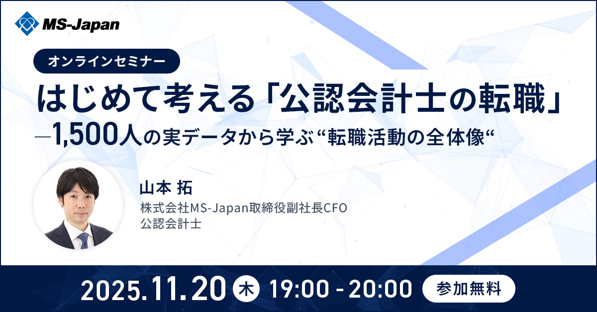 会計領域をはじめとした管理部門・士業に特化した転職エージェントを運営する、株式会社 MS-Japan(本社:東京都千代田区 代表取締役会長兼社長CEO:有本隆浩/以下 MS-Japan 証券コード:6539)は、若手公認会計士向けの無料オンラインセミナー「はじめて考える『公認会計士の転職』」を、2025年11月20日(木)に開催いたします。