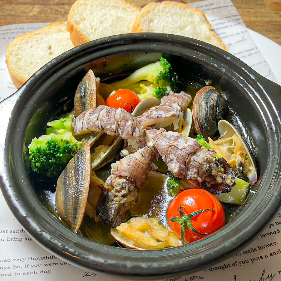 秋シャコに加え、こちらも秋に旬を迎える道産のアサリを入れることにより海鮮の旨味をさらにプラス!辛口の白ワインやビールとともに味わっていただきたい逸品です。