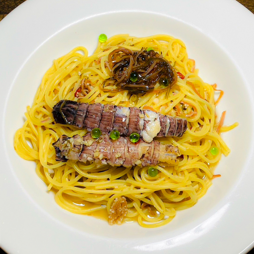 シャコを丸ごと使い、松前漬けをトッピングした和風パスタ。ワサビオイルを閉じ込めた「わさビーズ」で彩りを添えるとともに、味わいにピリっとしたアクセントをプラスしています。