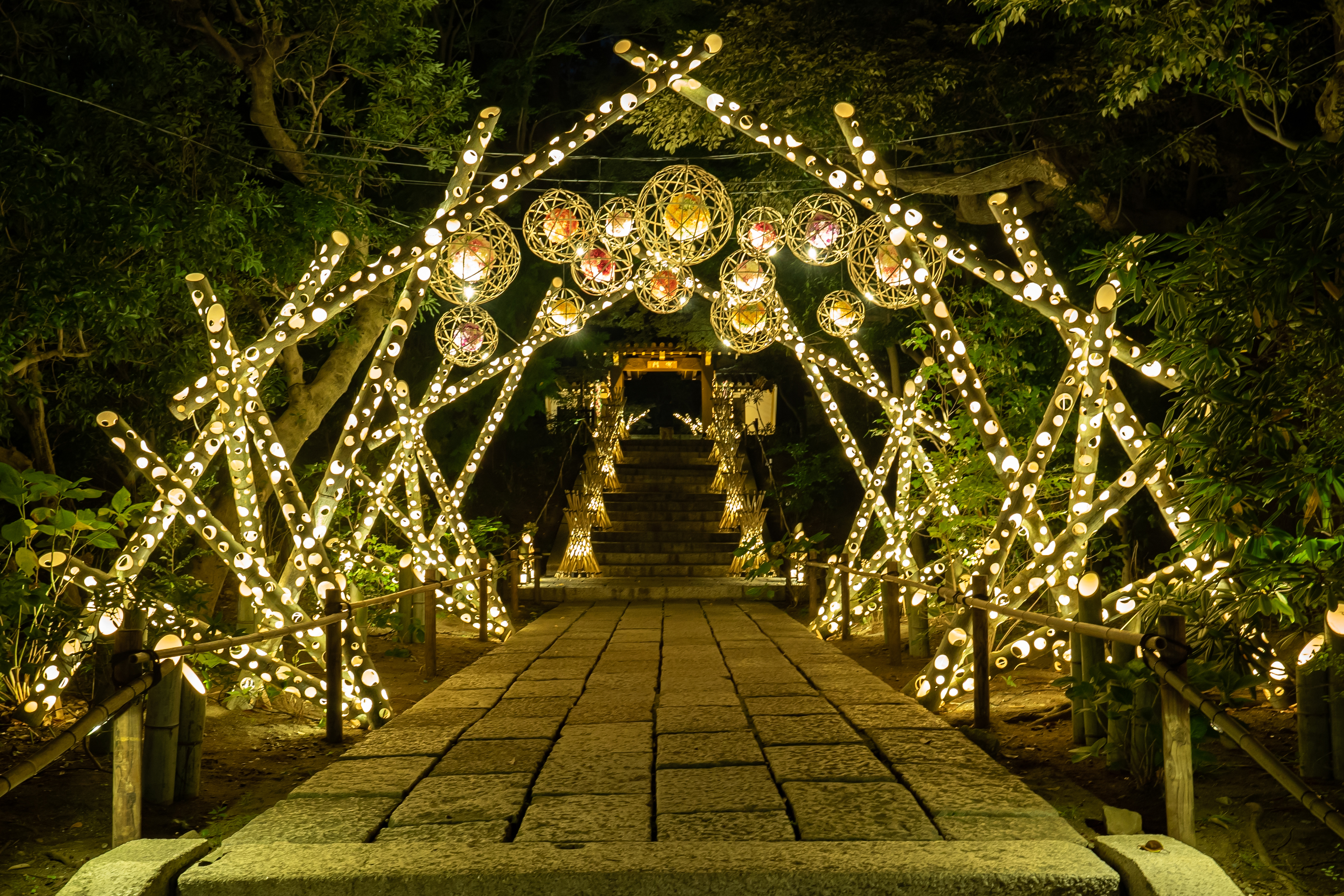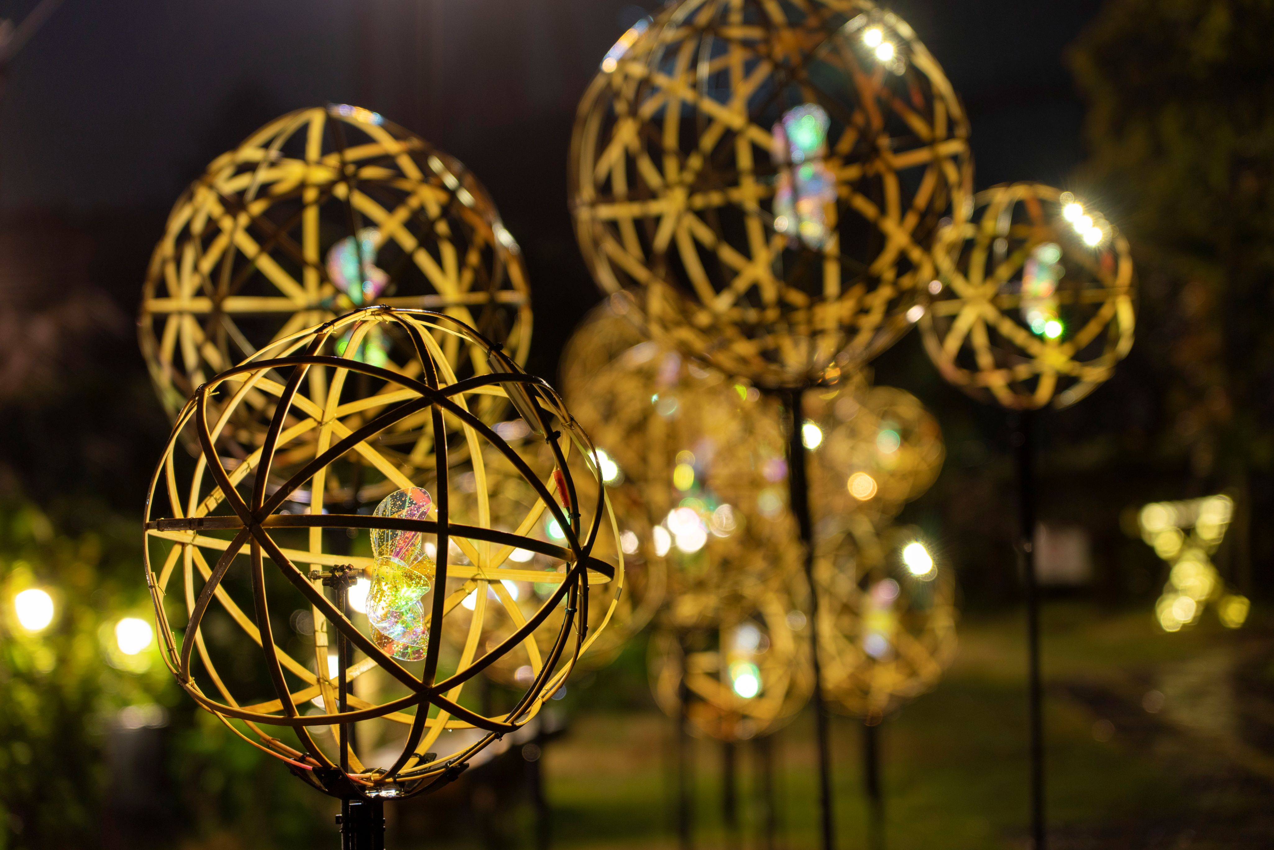 「HANAあかり」は竹オブジェにあかりを灯す竹あかりと、優美にライトアップされた樹木や花々・文化財により、園内が柔らかな光に包まれる和のイルミネーションイベントです。今年から「灯華大輪(とうかたいりん)」や「和灯(わあかり)のやぐら」など、様々な新スポットが登場します。今回のバージョンアップも、自然との共生を目指す竹あかり演出集団「CHIKAKEN(ちかけん)」が手掛けます。