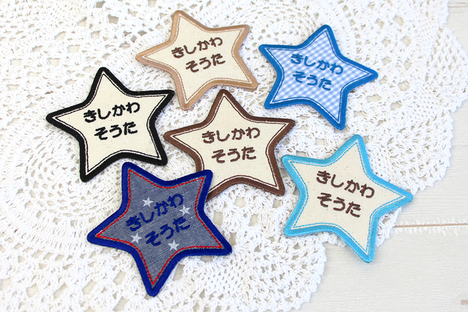 同じ生成生地、パターン生地を使用した、サイズ違いのお名前ワッペンです。