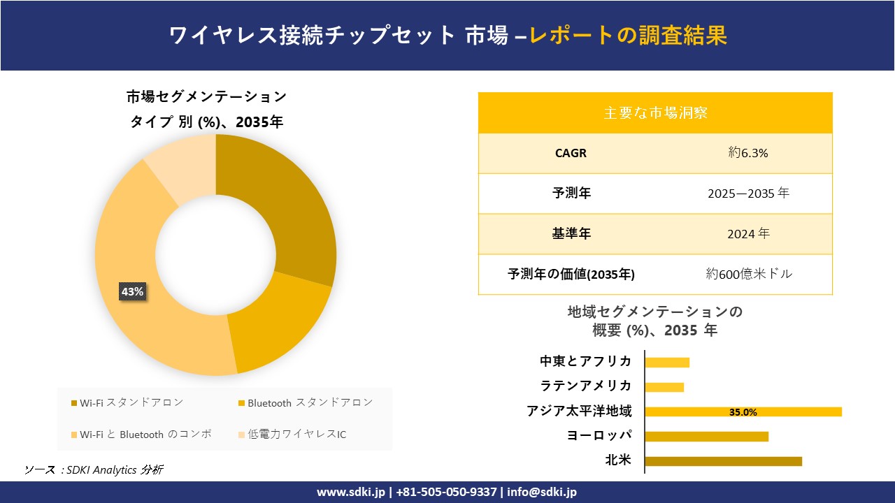 東京都渋谷区、2025年10月17:SDKI Analyticsはこのほど、「 ワイヤレス接続チップセット市場に関する調査レポート : 予測2025―2035年」を発行しました。調査レポートは、 ワイヤレス接続チップセット市場の成長に貢献する統計的及び分析的アプローチに焦点を当てています。当社の読者は、現在の市場シナリオに関する明確なイメージを得るとともに、詳細な調査レポートで提供される主要な業界の洞察から将来の傾向についても理解します。ワイヤレス接続チップセット市場に関するこの調査レポートは、一次調査方法と二次調査方法の両方を利用して、市場の成長に伴う現在及び将来の市場動向を分析します。