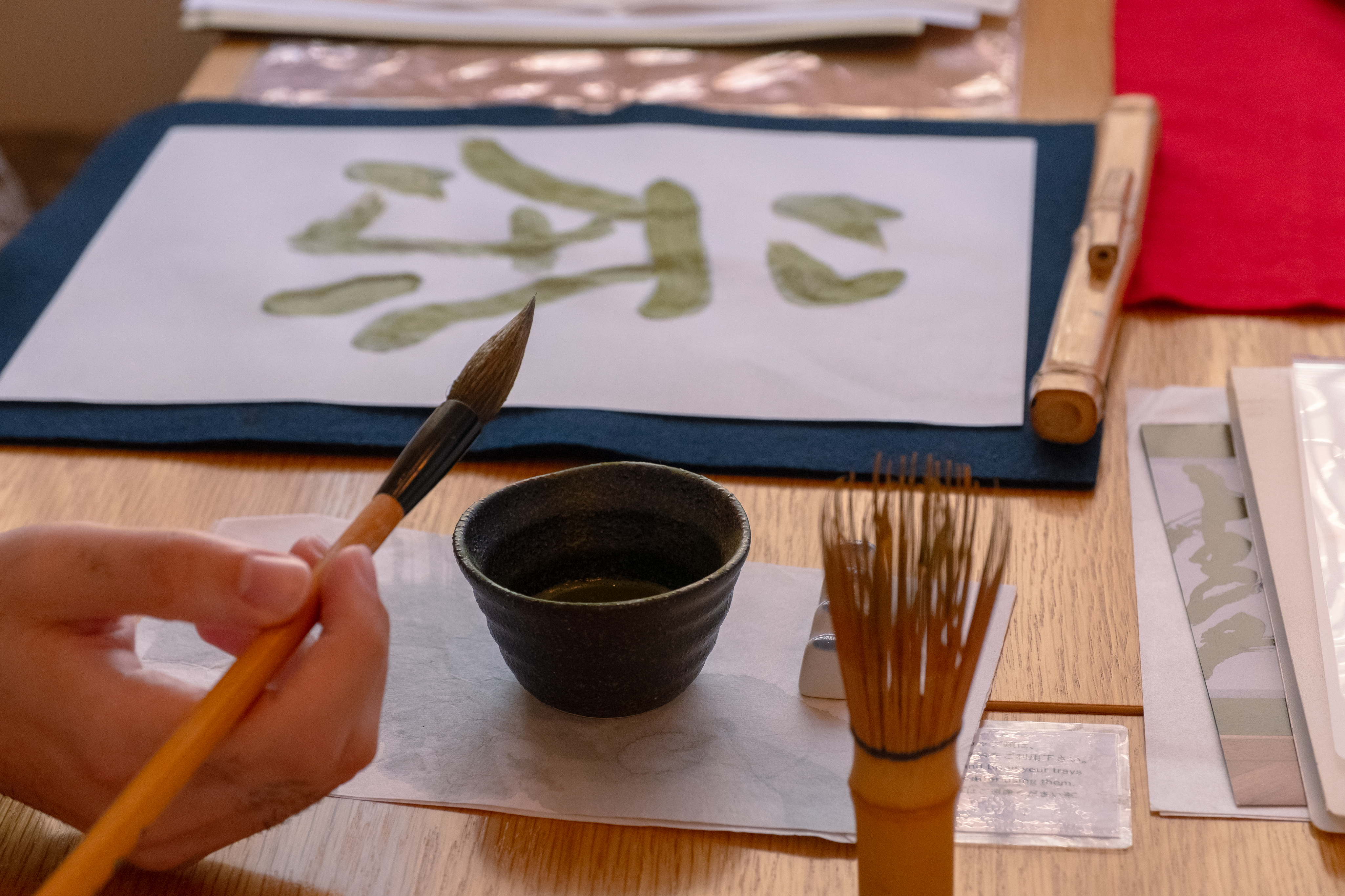 - 日本伝統工芸のワークショップ、抹茶の書道体験
