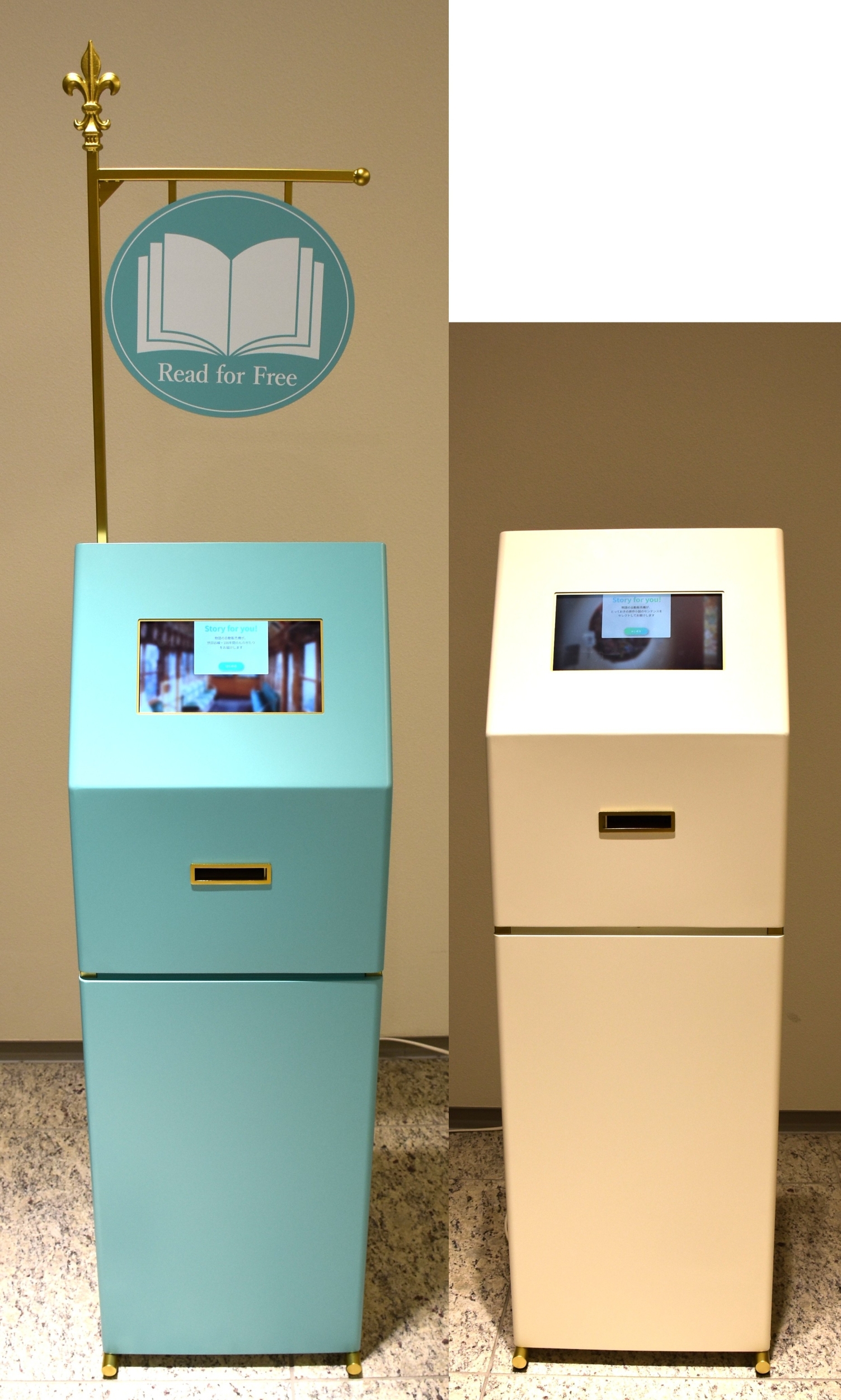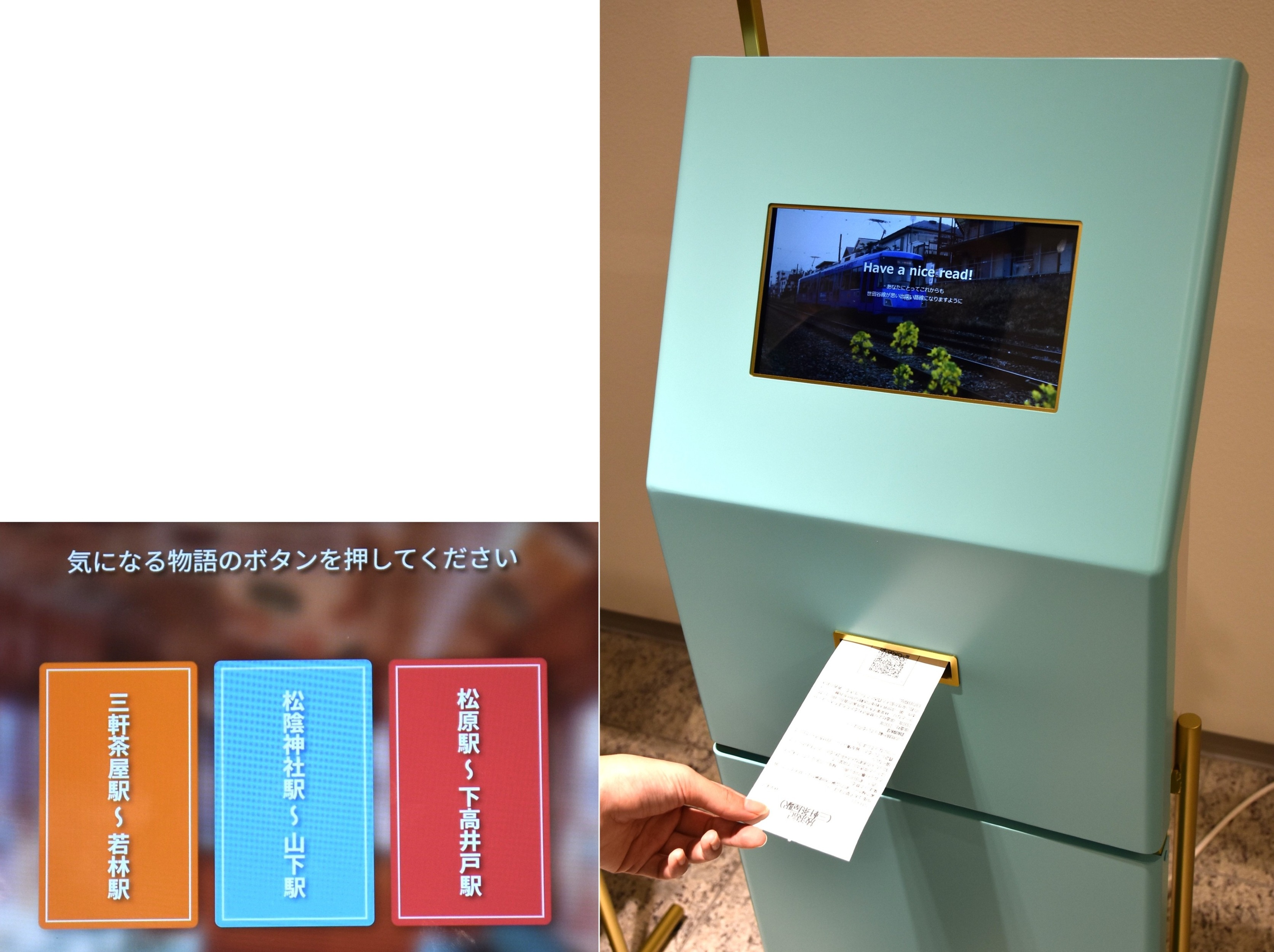 - 専用に開発した「物語の自動販売機」に、複数のショートストーリーを登録して街中や施設内に設置します。ユーザーの操作によりストーリーをランダムに印刷して、その場で無料頒布するサービスです。