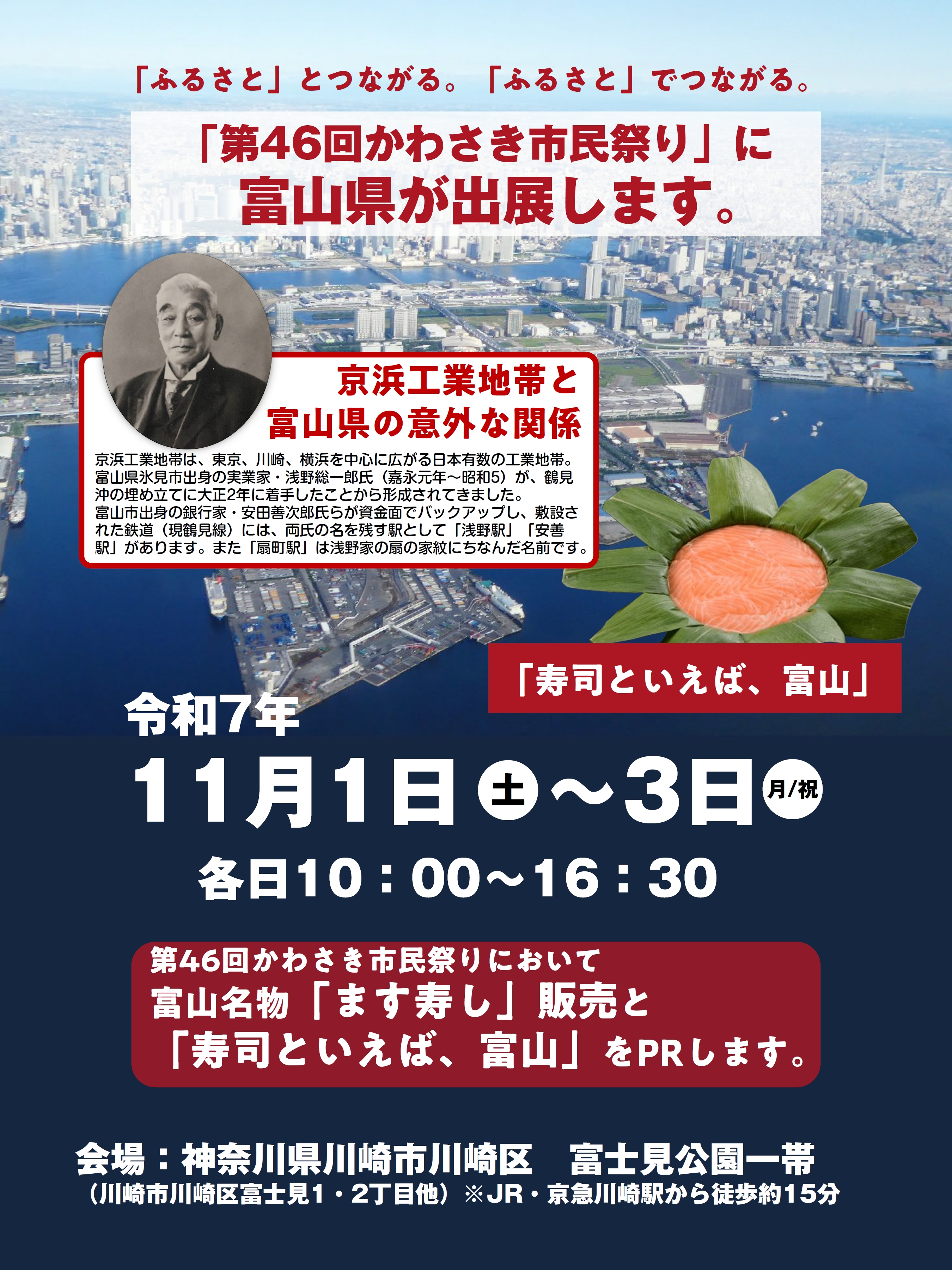 浅野総一郎翁を通じて富山と川崎の「つながり」を発信。富山名物「ます寿し」を会場で販売します。