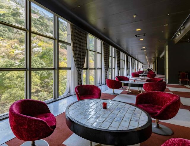 奥道後 壱湯の守の本館は、一級河川・石手川の渓流に沿って建ち、まるで川に迫り出すような立地が特徴です。今回の改修では、石手川沿いの大自然をより身近に感じていただけるよう、京都の文化として国内外に知られる「川床」を取り入れ、愛媛ならではの新たな魅力を創出しました。源泉かけ流しの露天風呂付き客室は、川に近い最下階に位置し、自然の渓谷を存分にお楽しみいただける空間としました。客室内は、日本の伝統美である蒔絵をコンセプトにした色彩でまとめ、日本の伝統と自然に包まれながら、心静かに身をお寛ぎいただけるしつらえとなっています。昼は杉立山の深い森が広がる雄大なパノラマ、夜は対岸のライトアップが幻想的な雰囲気を演出し、時間帯ごとに異なる景観をお楽しみいただけます。