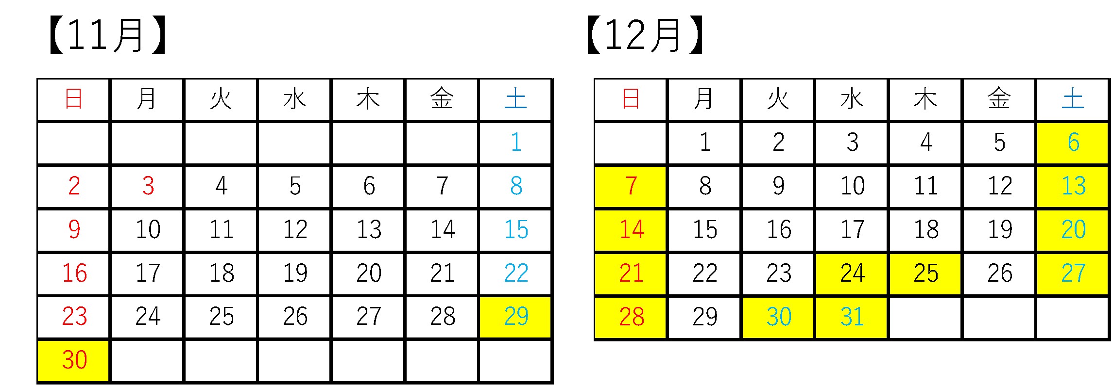 ※下表カレンダーの黄色着色日実施。青字・赤字の日は土曜・休日ダイヤで運行します