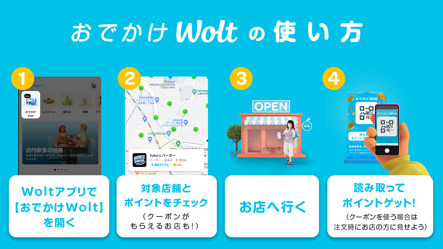 - 飲食に使えるクーポンを提供しているお店は、Woltアプリで確認できます。クーポン利用時は、ご注文の際に店舗のスタッフにお見せください。アプリに表示された「クーポンを使う」ボタンを押して、店内の専用スタンド上のQRコードをスマートフォンで読み込むと、お店毎に設定されたWoltポイントがお客様のアカウントに加算されます。
