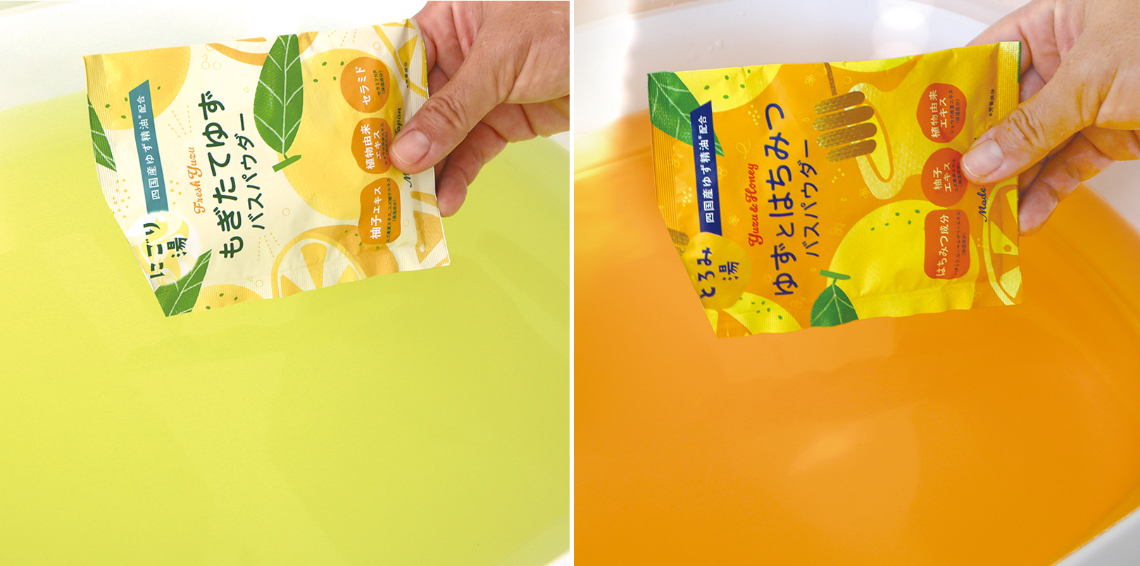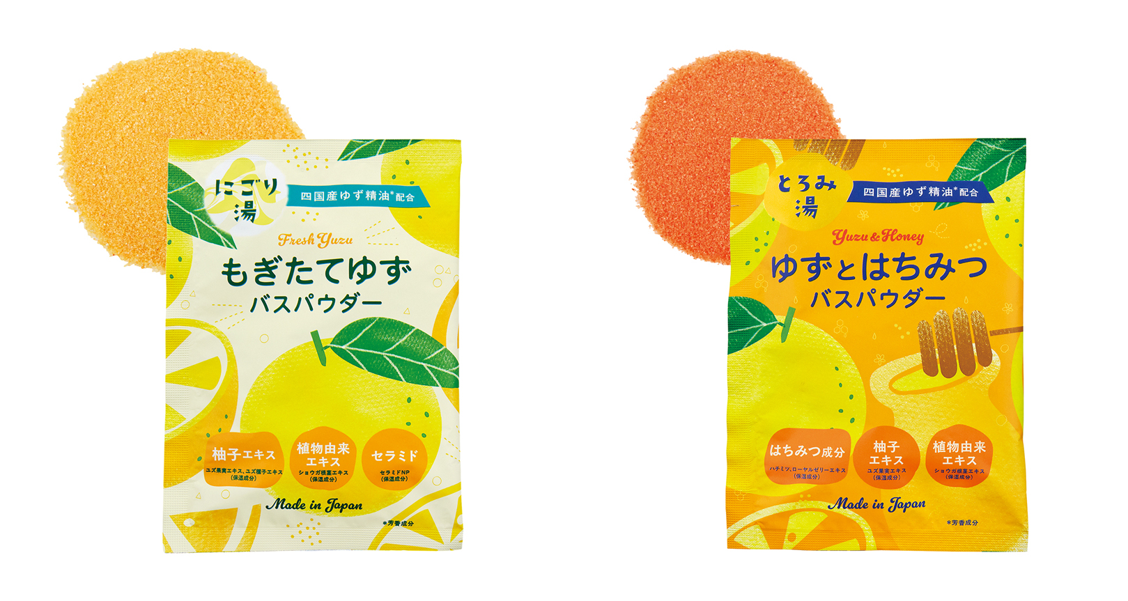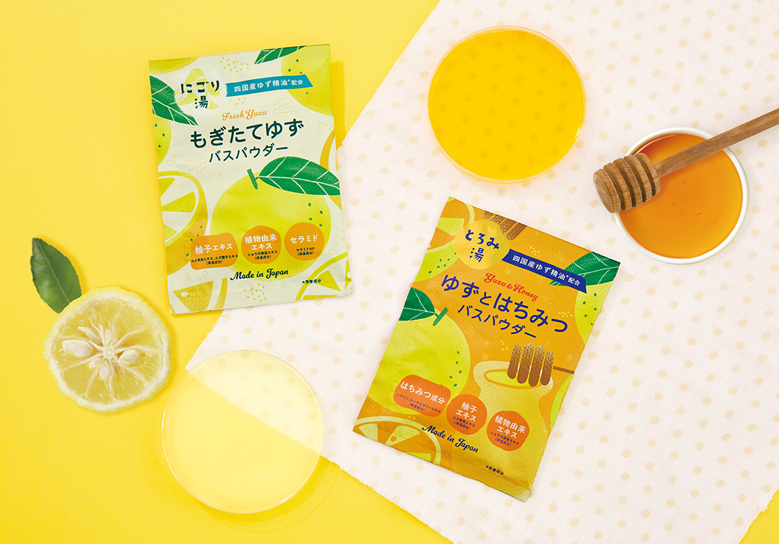 四国産ゆず精油がやさしく香る、さらっとお湯に溶けるパウダータイプの入浴料。日本製