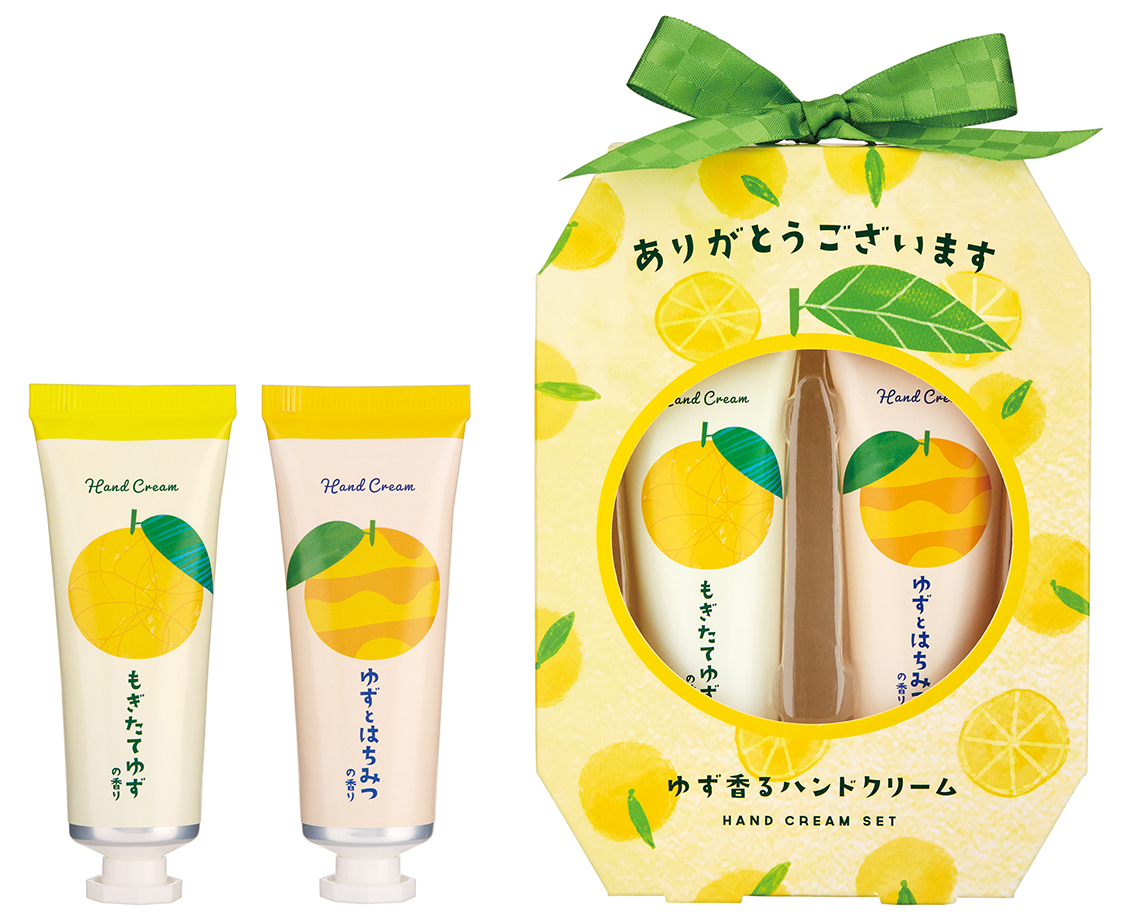 ●ゆず ハンドクリームセット 価格 990円(税込) セット内容:ハンドクリーム25mL2個(もぎたてゆず、ゆずとはちみつ)