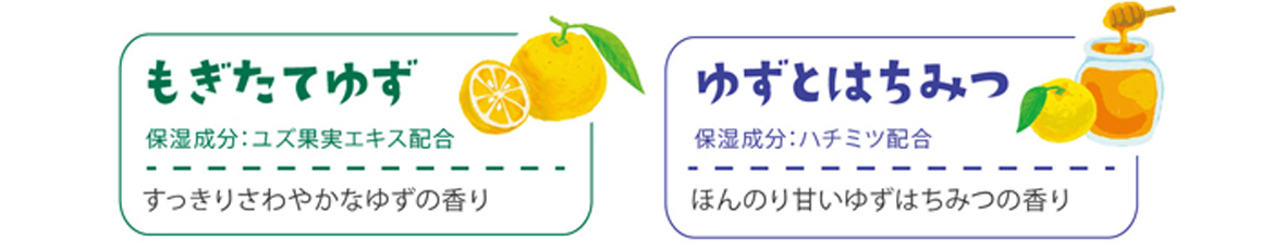 もぎたてゆず:すっきりさわやかなゆずの香り ゆずとはちみつ:ほんのり甘いゆずはちみつの香り