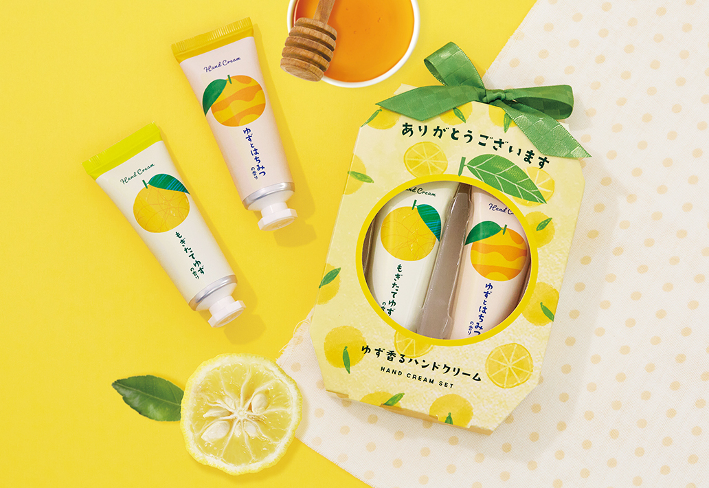 四国産ゆず精油の香りを楽しめるハンドクリームギフト。保湿成分のワセリンとホホバ種子油が手指をしっかりうるおします。贈り物としてもおすすめです。