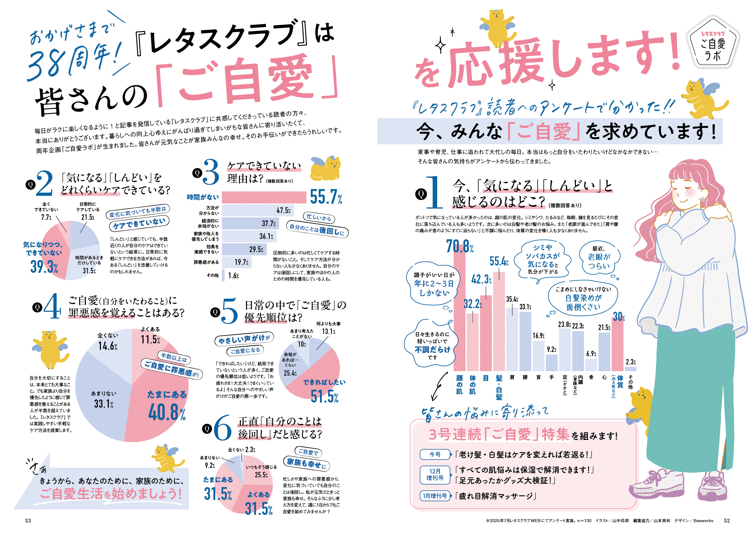 どの特集も、知っているようで知らなかった原因や対処法、すぐにできて効果的なテクが満載。暮らしの中に、少しでも「ご自愛」を取り入れるきっかけになるように…そんな思いを込めた特集です。