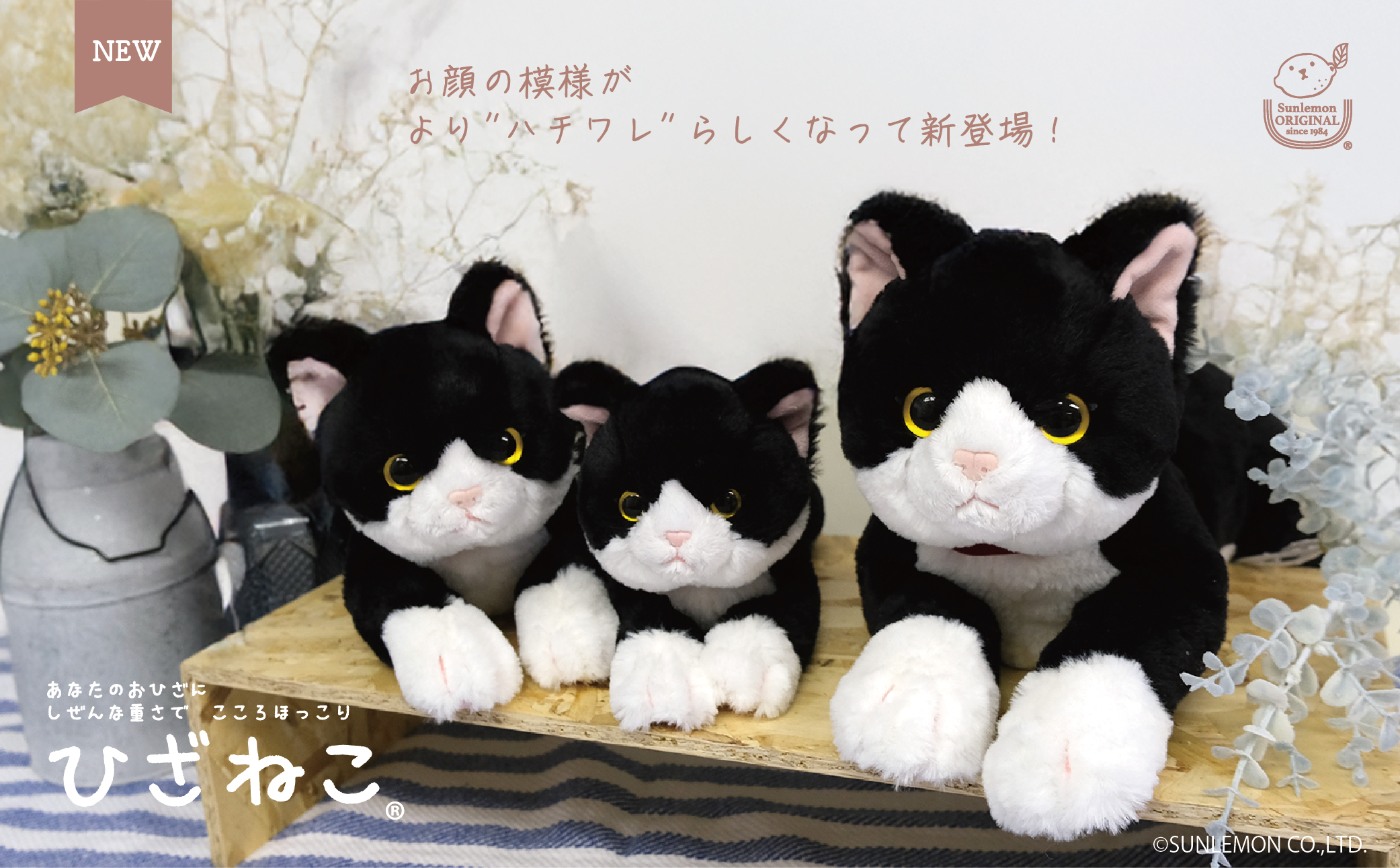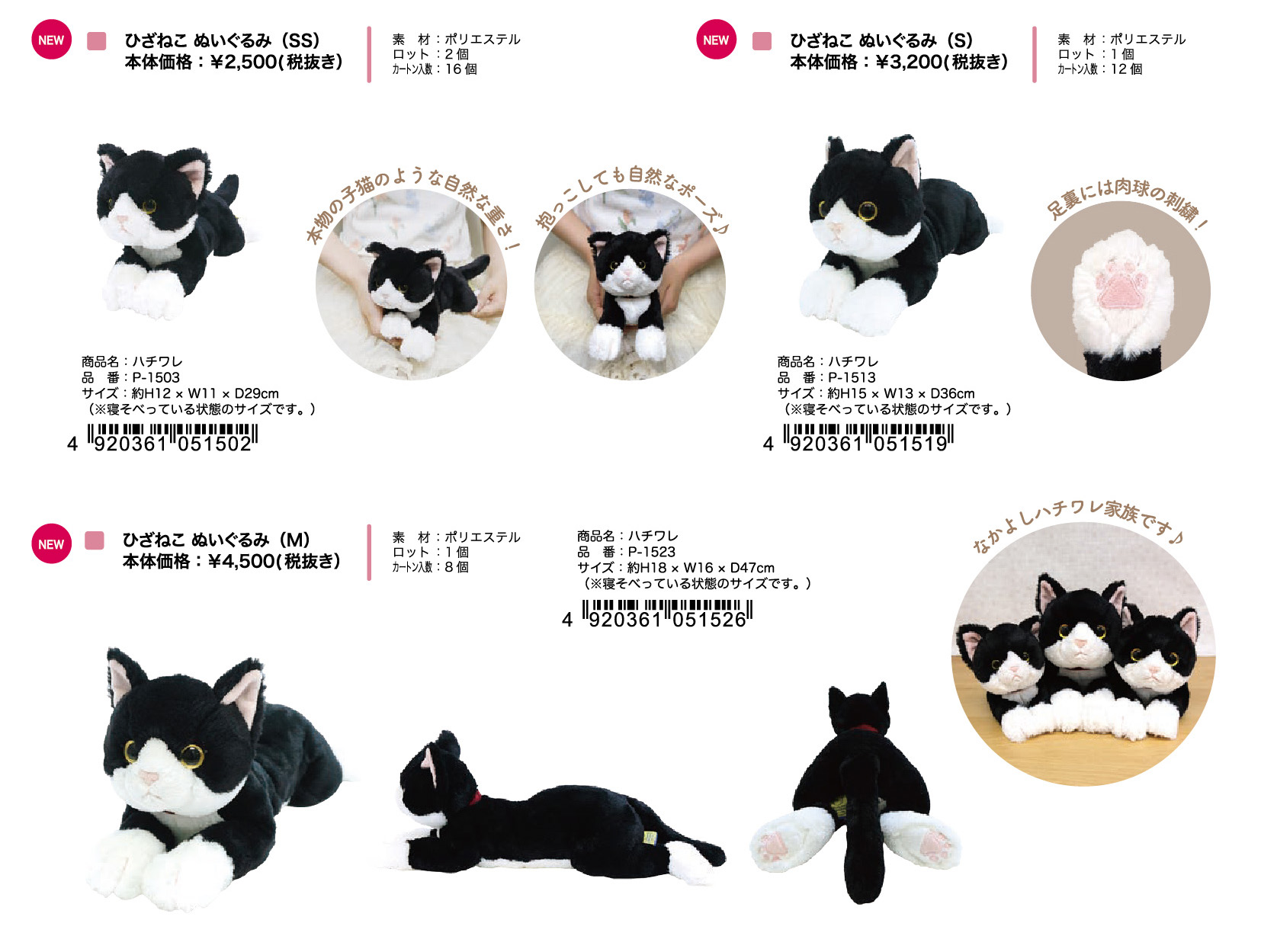 ひざねこシリーズにお顔の模様がよりハチワレらしくなった ひざねこが新登場いたします♪ ハチワレ好きにはたまらない!SS・S・Mの3サイズ同時に10月中旬発売 いたしました!
