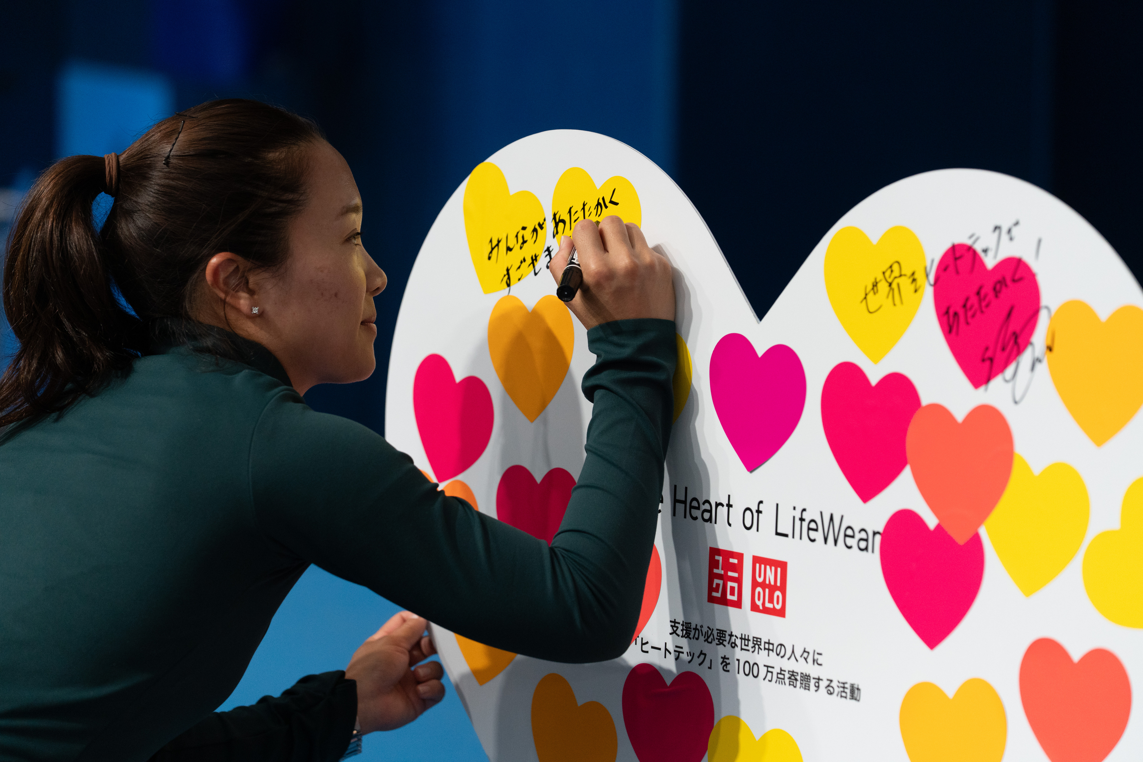 続いて、「The Heart of LifeWear」のハートにちなみ、ハートのシールをパネルに貼るワークショップが実施されました。「想いをつなぐリレー」を完走して受け取ったハートのシールを、参加者ひとり一人が想いをこめてボードに貼り付け、最後に、国枝さんが、サインと「世界をヒートテックであたたかく!」とメッセージを添えてボードが完成。