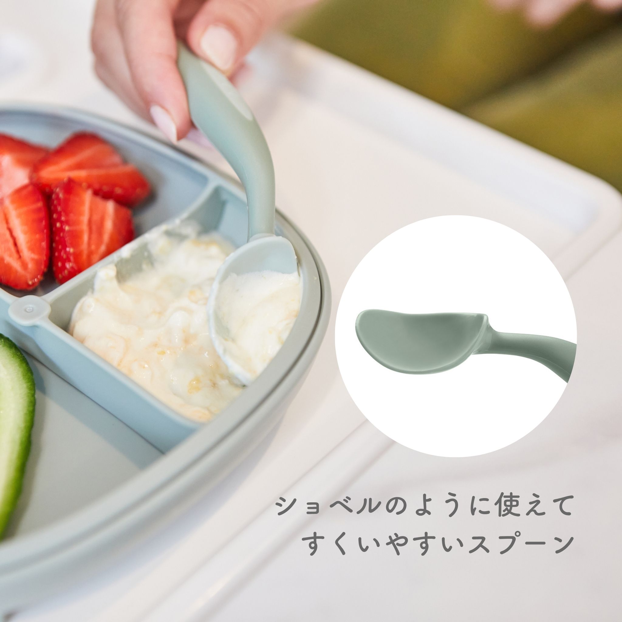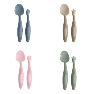 自分で食べる意欲が持てるデザインのほか、BPA、フタル酸エステル類、およびPVCを使用していない素材でできており、安心してお使いいただけます。また、グー握りもしやすく、先端は口に運びやすい大きさのため、離乳初期のお食事補助から、赤ちゃんがはじめて自分でカトラリーを使う練習にも最適です。