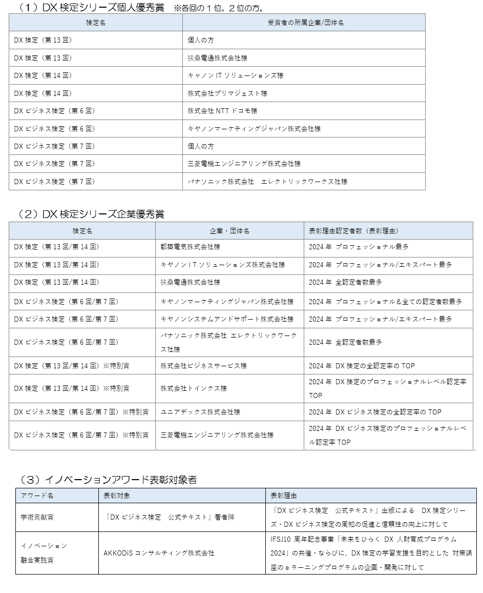 一般社団法人 日本イノベーション融合学会(IFSJ)は、イノベーションを実践してきた方々の優れた業績を称えるための「IFSJイノベーション アワード」を2025年10月23日(木)に開催します。この度、2024年度に「DX検定 (TM)シリーズ」を受検された企業・個人のうち、優秀企業10社、個人9名様の所属企業などの受賞企業名が発表されました。