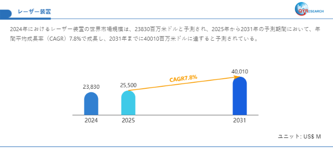 2024年におけるレーザー装置の世界市場規模は、23830百万米ドルと予測され、2025年から2031年の予測期間において、年間平均成長率(CAGR)7.8%で成長し、2031年までに40010百万米ドルに達すると予測されている。