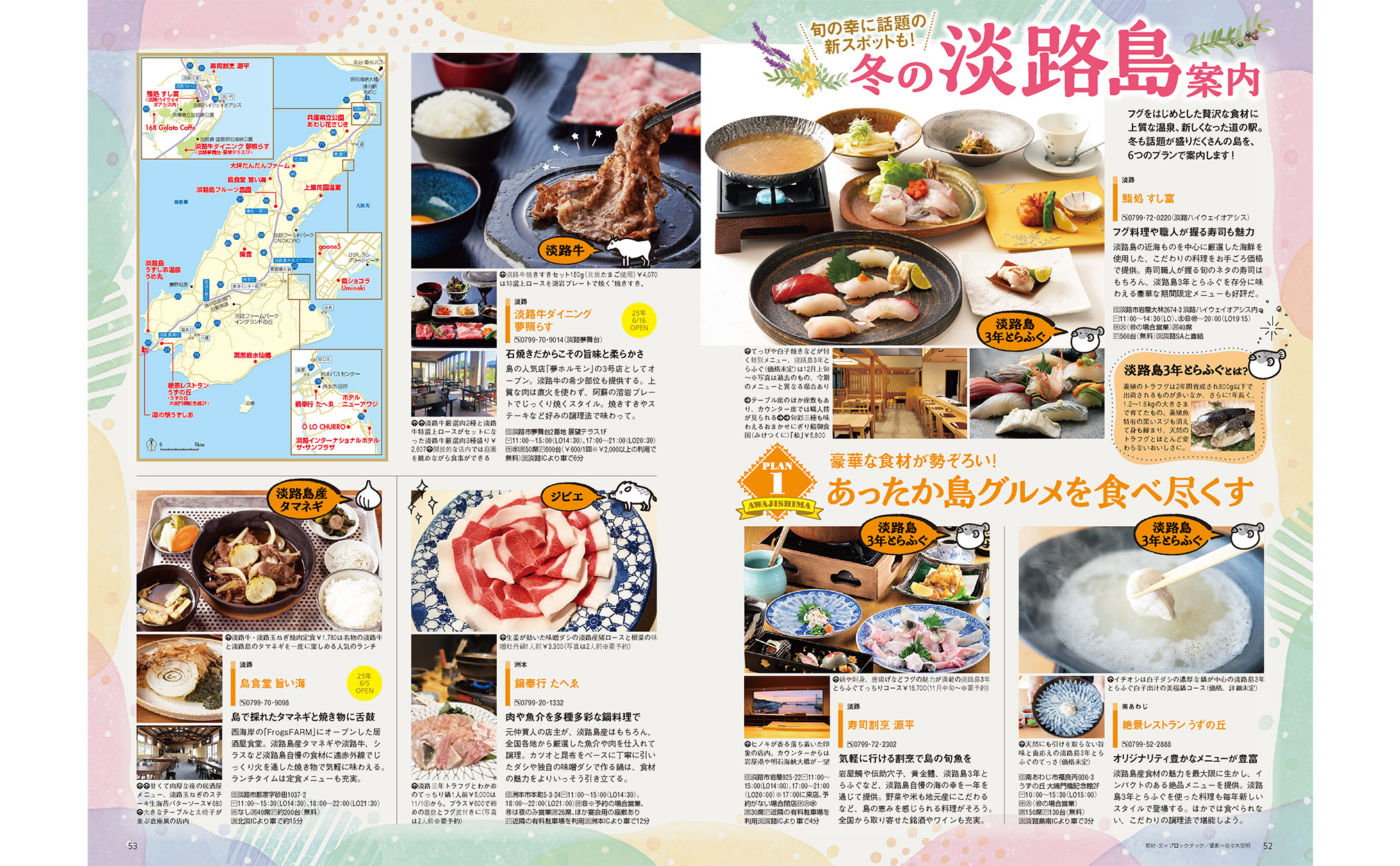 フグをはじめとした贅沢な食材に上質な温泉、新しくなった道の駅。冬も話題が盛りだくさんの島を、「あったか島グルメ」や「新カフェ&スイーツ」など6つのプランで案内します。