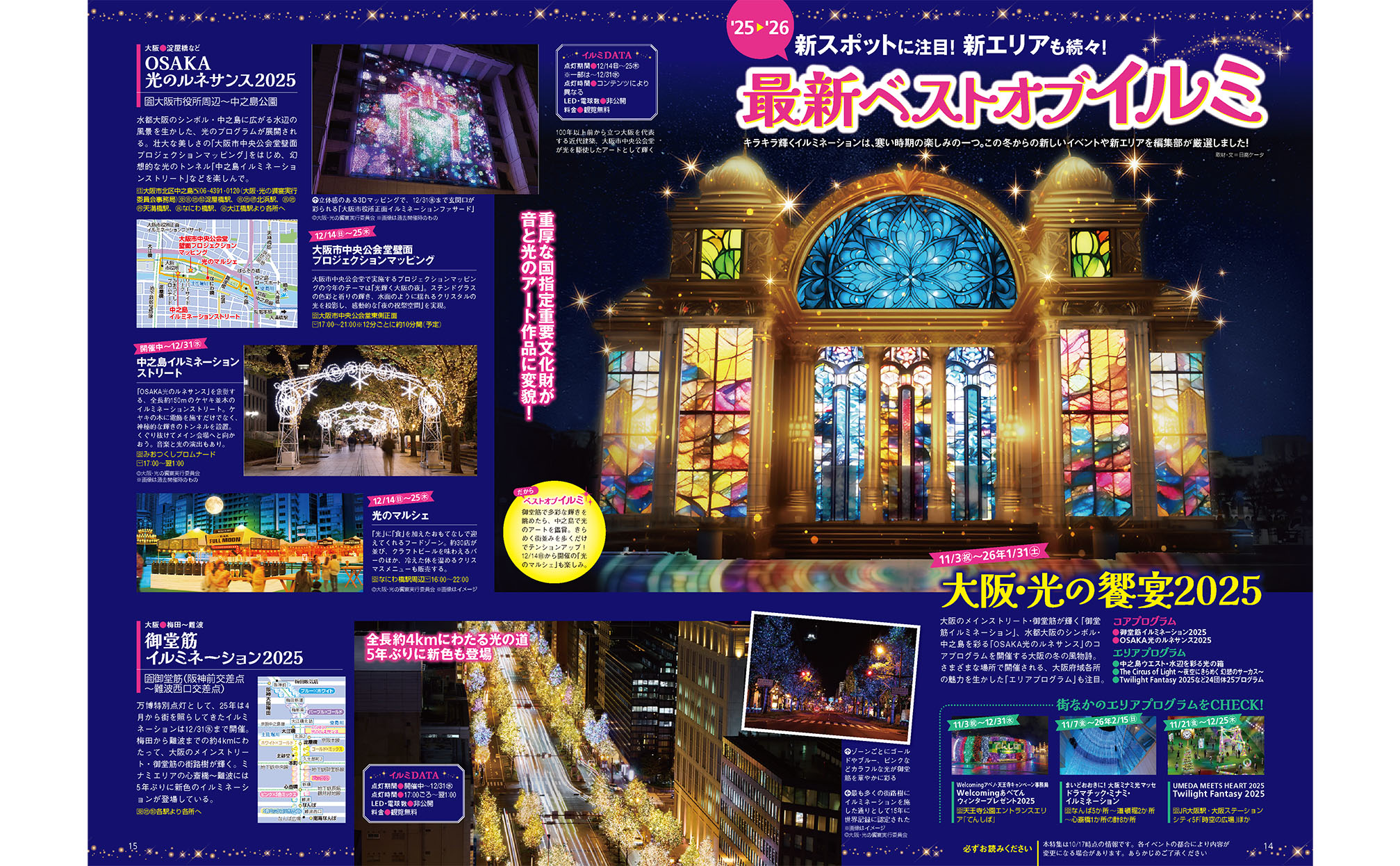 今回は、日帰りで名湯とグルメを楽しむおでかけコースを始めラーメンの新店や最新のイルミネーションなどを大特集。グルメやスーパー銭湯の割引クーポン企画など、お得に遊べる情報も満載です。翌2月まで使える保存版となっており、関西エリアを中心とした書店やコンビニ、ECサイトなどでお買い求めいただけます。本誌の主な内容は以下の通りです。