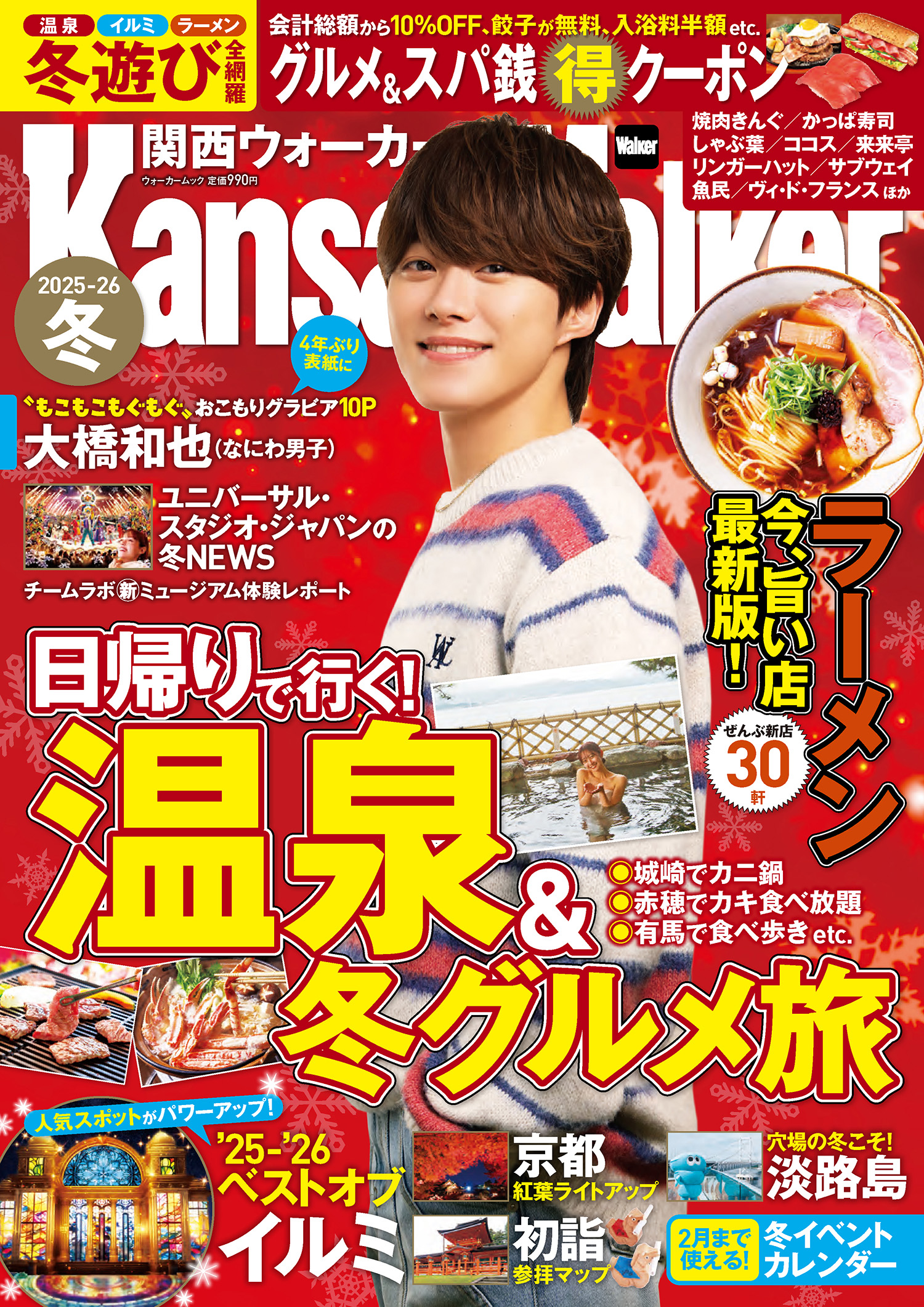 『関西ウォーカー2025-26冬』が10/30発売!日帰り温泉&冬グルメなど冬遊びを大特集。4年ぶりの表紙登場・大橋和也さん(なにわ男子)の “もこもこもぐもぐ”おこもりグラビアは必見!