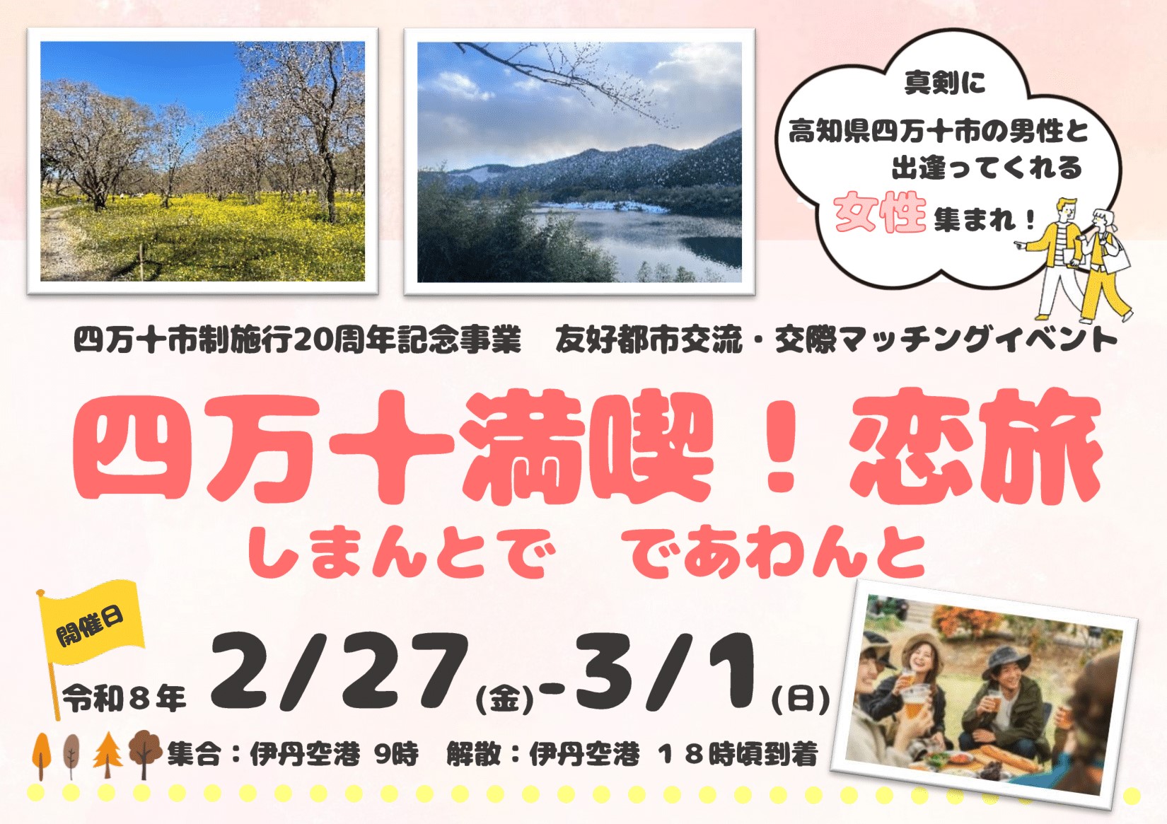 四万十市制施行20周年を記念し、友好都市である大阪府枚方市とその周辺市町村(伊丹空港に集合可能ならどこに居住していてもOK)から女性参加者を募り、婚活イベントを開催いたします。