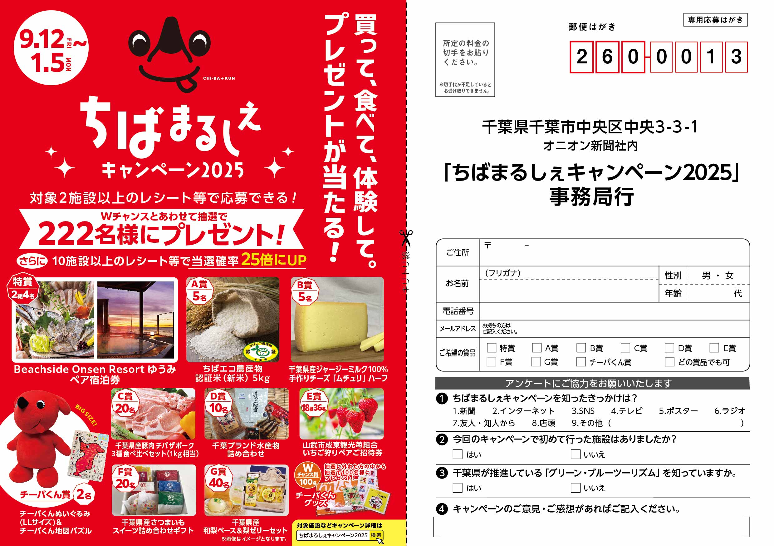 千葉県農林水産部農地・農村振興課(所在地:千葉市中央区市場町1-1/事務局:株式会社オニオン新聞社、本社:千葉県千葉市中央区、代表取締役:山本 寛)では、秋から冬にかけて多く出回る旬の県産農林水産物を多くのお客様に味わっていただけるよう、道の駅や直売所など複数の対象施設を利用した方に豪華なプレゼントが当たる「ちばまるしぇキャンペーン2025」を2025年9月12日より開催しています。