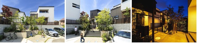行き止まり道路に面し、高低差2m超の敷地に建つ3棟の分譲住宅です。独立したエントランスを集約し、自然な交流が生まれる「つながりの踊り場」を創出しました。擁壁・建物・外構を一体で設計し、人と車の動線を分け、地域とのつながりと住民同士のコミュニティ形成を促進するデザインです。
