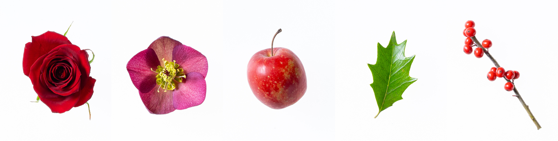 クリスマスの季節感を表現するため、花や実をふんだんに使用しました。使用した植物の一部をご紹介します。