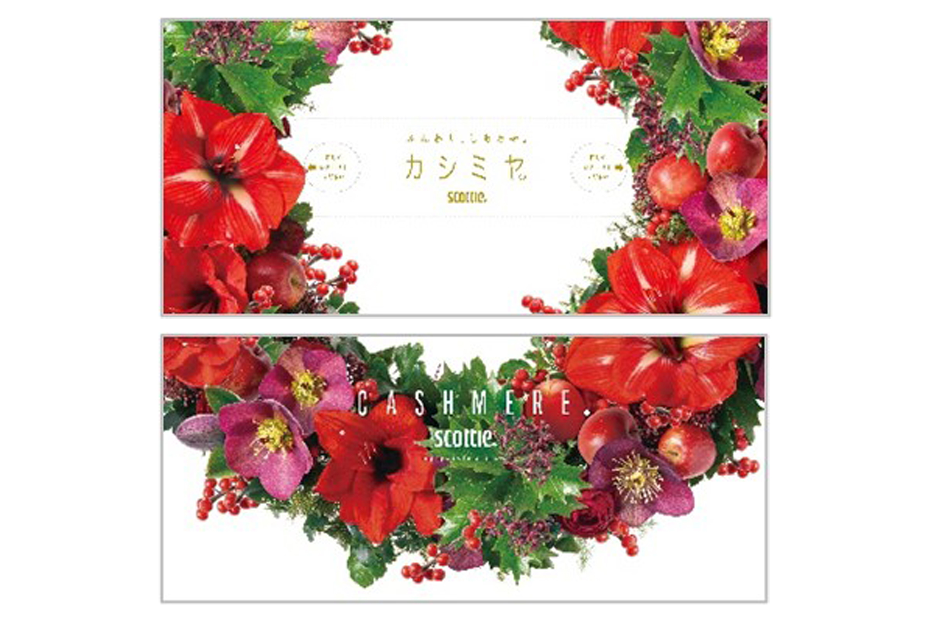 『クリネックス』『スコッティ』の特別なパッケージデザインに合わせて、ホリデーシーズンをイメージした生花のリースをデザインしました。このパッケージが、年末年始を華やかに彩るアイテムとして、多くの方に楽しんでいただけることを願っております。