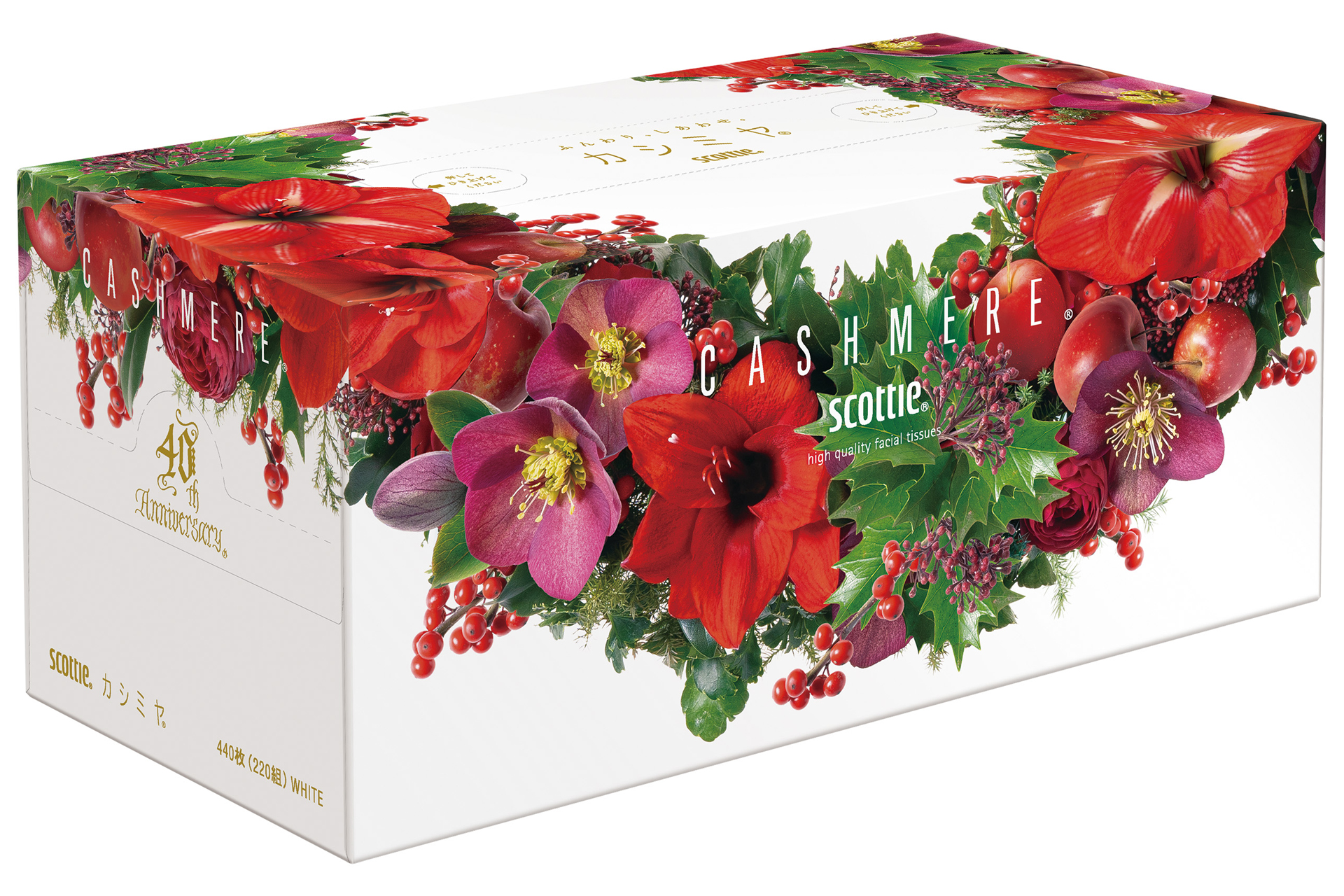 今年発売40周年を迎える『スコッティ カシミヤ』の数量限定パッケージ。カシミヤならではの白いボックスに、赤い花々を中心としたクリスマスリースを全面にあしらった特別なデザインです。