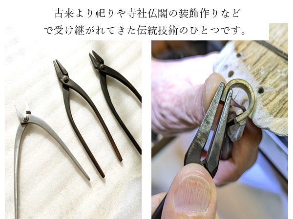 錺は「かざり」と読み、『金(属)を芳しいまでに装飾する』ことから作られた文字と云われ、日本でも古来より寺社仏閣・祀りの装飾品等の製作から受け継がれてきた伝統技術のひとつです。