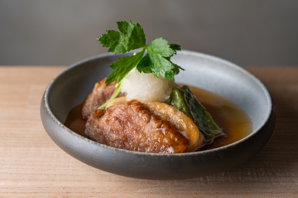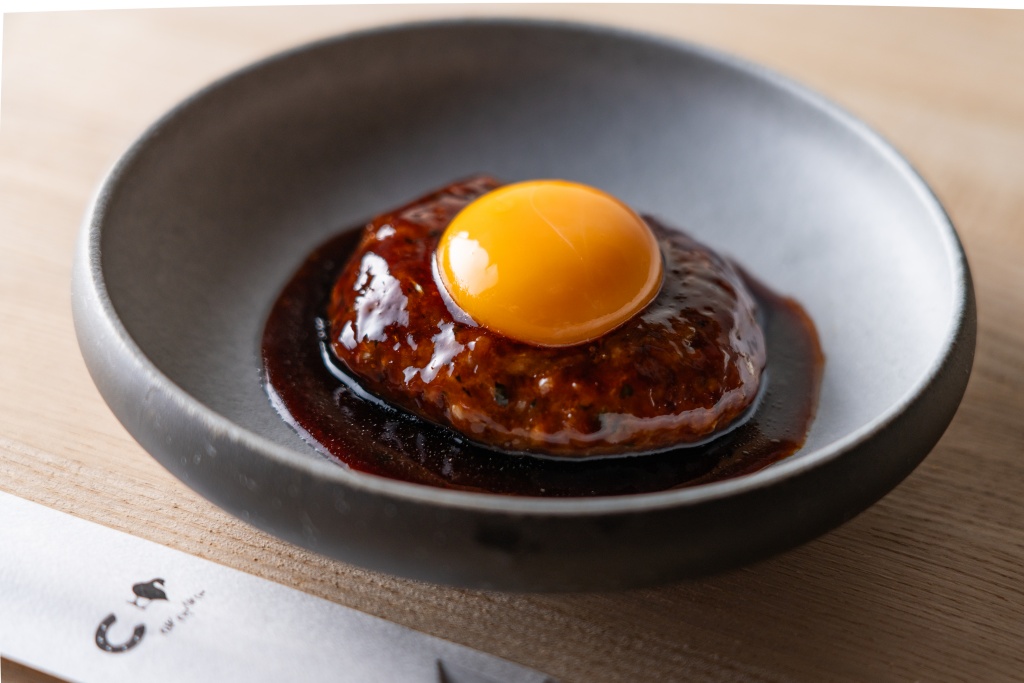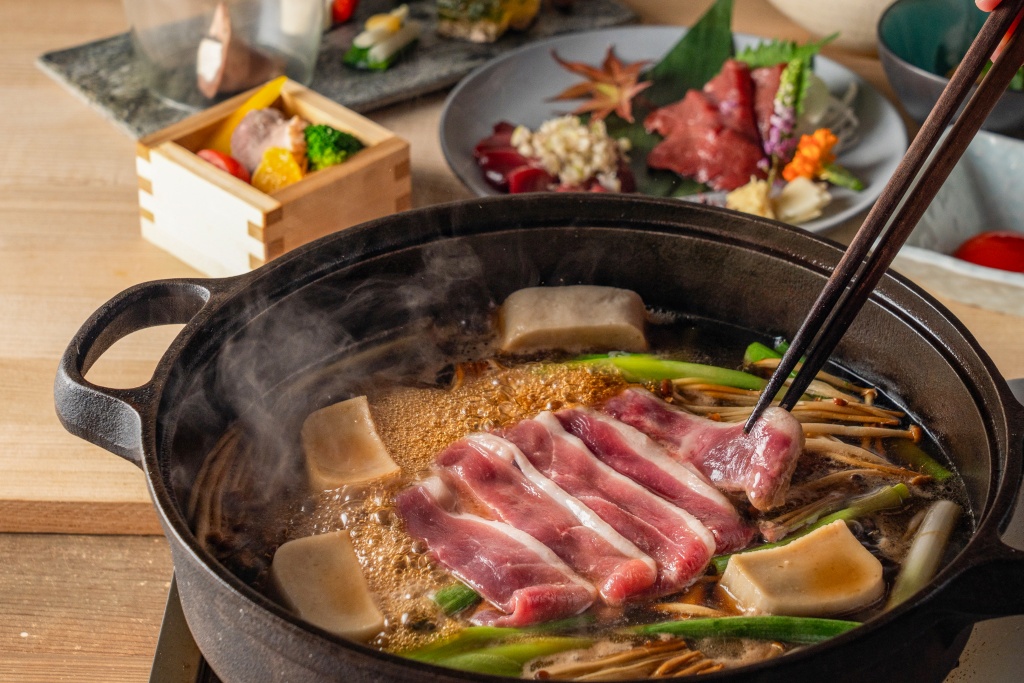 「岩手鴨」と「九条葱」に加え、ブラウンえのき、生麩といった具材を、醤油、酒、砂糖、味醂などを合わせた濃厚甘辛味の割り下でひと煮立ちさせ、生卵を絡めて召し上がっていただく一品。
