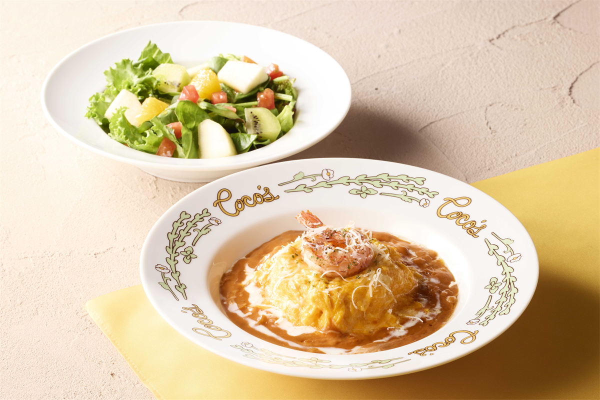 ハーフサイズの“炙り赤海老のふわとろオムライス”と、フルーツとオレンジハニーソースでさっぱりとお召し上がりいただける“ココスのフルーツサラダ”がセットになったメニューです。