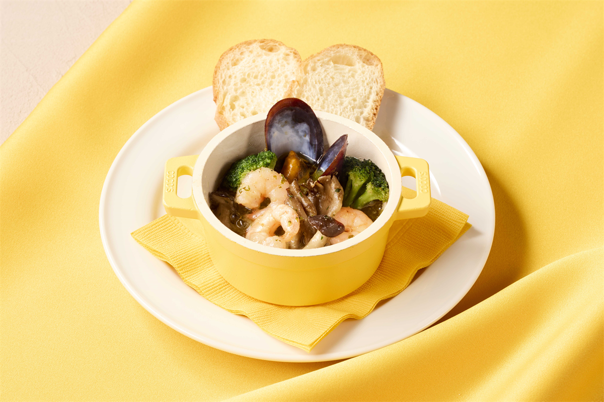 ぷりぷり食感の海老とムール貝、しめじや舞茸などの具材に、アンチョビとニンニクの旨みが溶け込んだオイルソースを合わせ、熱々のアヒージョに仕上げました。具材の旨みたっぷりのソースをバゲットと合わせてお楽しみください。