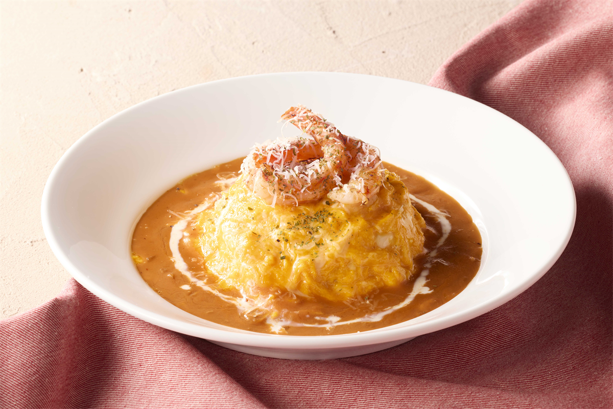 ブランド卵“茜美人”を3個使用した、ココスで人気のふわとろオムライスに、海老とカニの旨みが詰まった濃厚なビスクソースをたっぷり回しかけ、炙り赤海老3尾とグラナパダーノチーズをトッピングしました。
