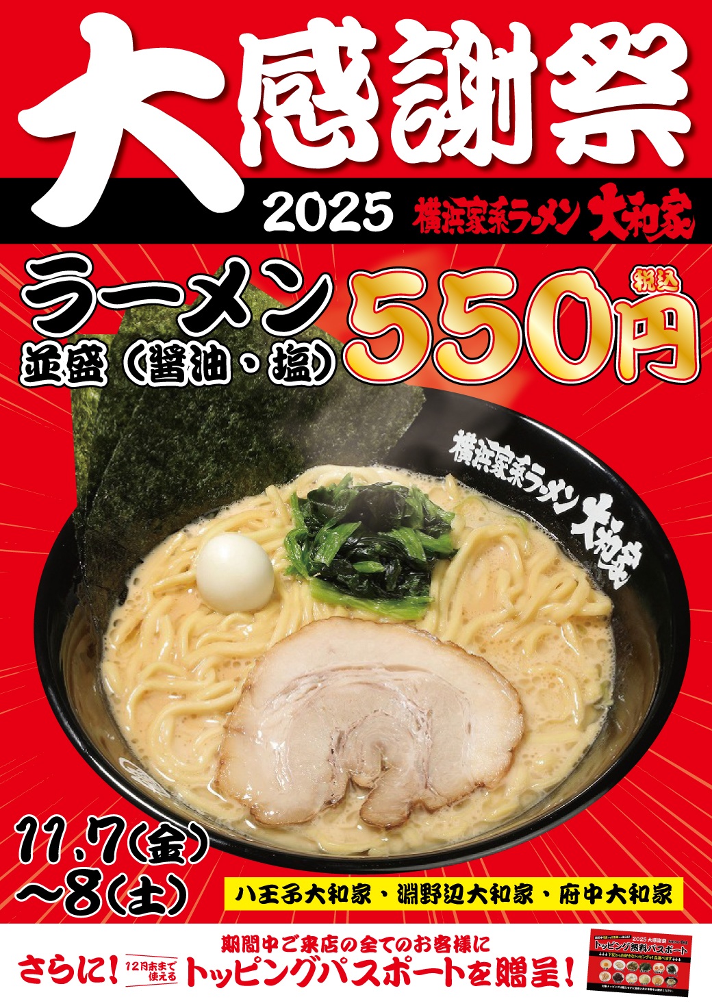 株式会社AZism(本社:東京都八王子市、代表取締役 和田 敏典)が展開する「横浜家系ラーメン大和家」は、日頃のご愛顧への感謝を込めて、2025年11月7日(金)・8日(土)の2日間と2025年11月7日(金)・8日(土)の2日間で「大感謝祭2025」を開催いたします。期間中は、当店人気の「ラーメン(並盛・醤油/塩)」を特別価格 税込550円 にてご提供いたします。