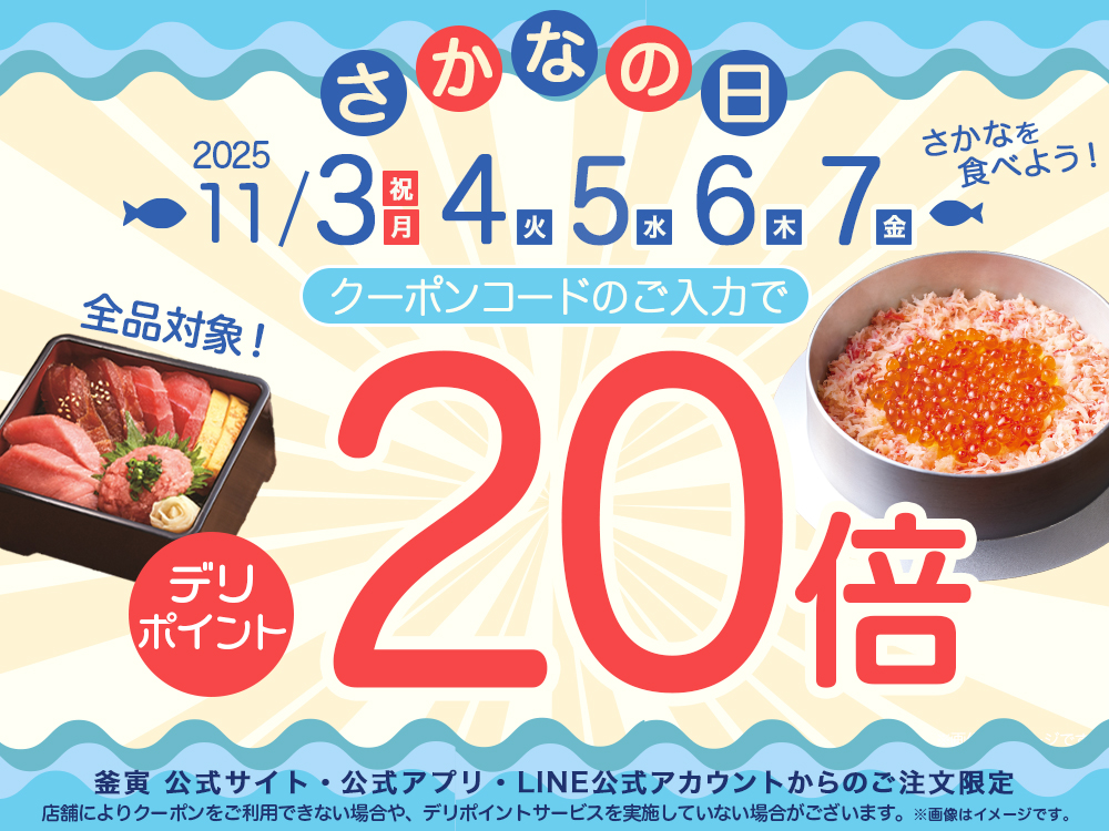 2025年11月3日(月・祝)~7日(金)「銀のさら」・「釜寅」公式サイト・アプリ限定期間内に専用クーポンの利用でデリポイントを通常獲得の20倍分プレゼントします。