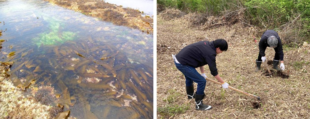 当社では、日頃より海からの天然資源を使った商品をお客様へお届けしています。多様で持続的な海洋資源を守っていくため、岩手県洋野町の「ウニの安定供給を目的とした増殖溝を使ったブルーカーボン事業」への出資や、ウニの生育環境を改善し品質向上を目指す「ウニの森づくり植樹祭」への参加等、積極的に環境保全に取組んでいます。