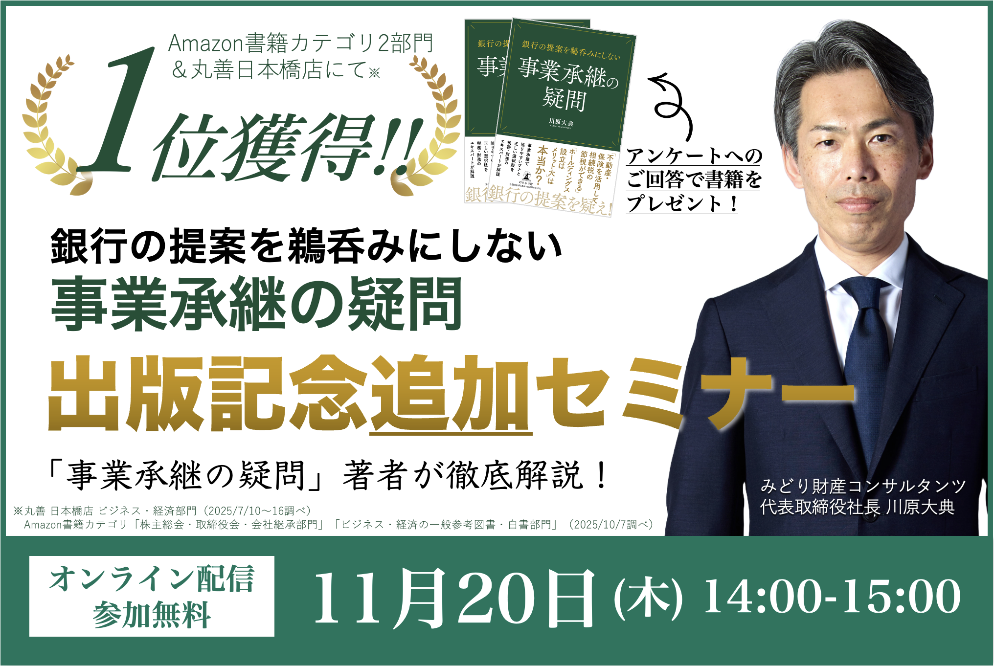 書籍『銀行の提案を鵜呑みにしない 事業承継の疑問』(弊社代表取締役社長 川原大典 著)がこの度、丸善 日本橋店(ビジネス・経済部門)で第1位を獲得(※1)、Amazon書籍カテゴリにおいて「株主総会・取締役会・会社継承部門」および「ビジネス・経済の一般参考図書・白書部門」の2部門で売れ筋ランキング第1位(※2)を獲得いたしました。この度のご好評を受け、セミナー第二弾を開催します!