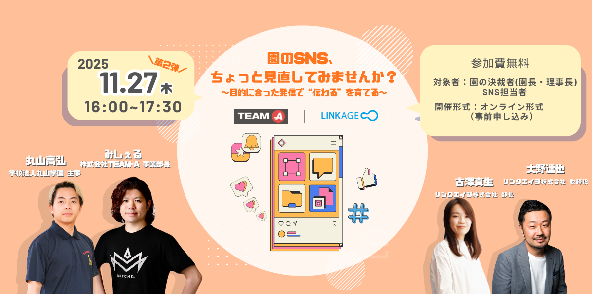 株式会社TEAM-A(本社:東京都港区)とリンクエイジ株式会社(本社:大阪府大阪市)は、2025年11月27日(木)16:00より、幼稚園・保育園・認定こども園を対象にした無料ウェビナー「園のSNS、ちょっと見直してみませんか?~目的に合った発信で”伝わる”を育てる~」を共同開催いたします。園児募集・採用・保護者発信、それぞれに合ったSNSの考え方というテーマについてお話いたします。