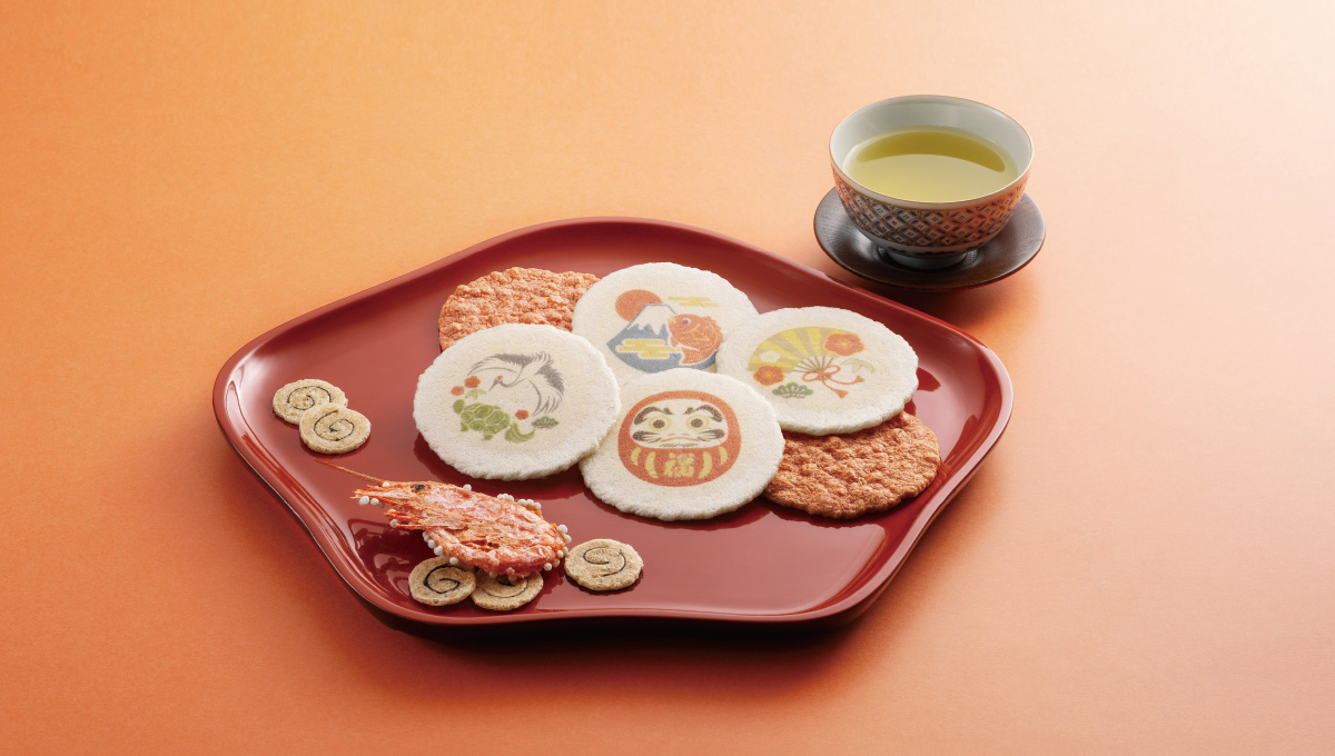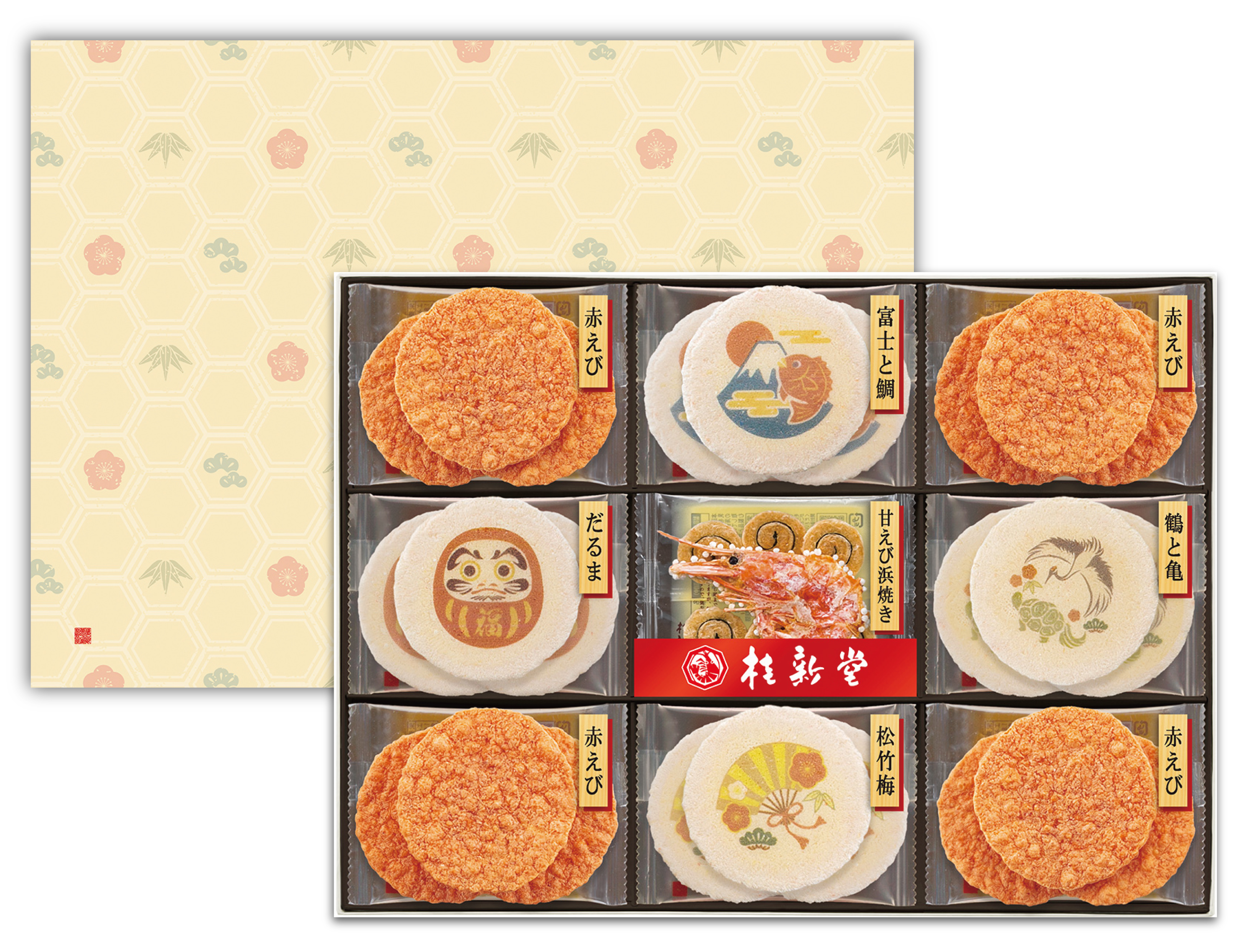 鶴や亀、だるまに富士山と鯛など、日本の縁起物を描いたえびせんべいの詰め合わせです。