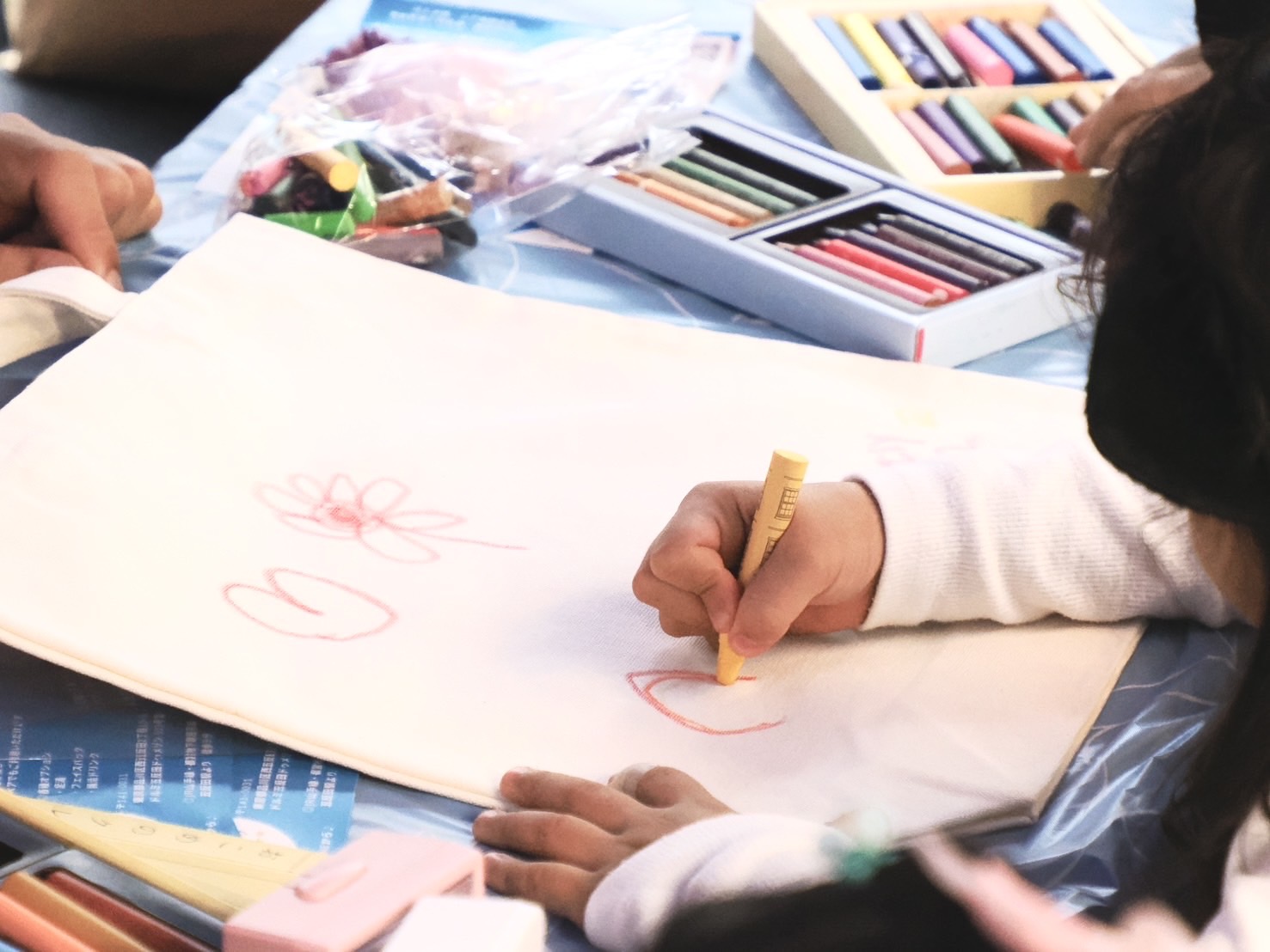トートバッグに、クレヨンを使って自由にデザインを施すオリジナルバッグ制作を実施。