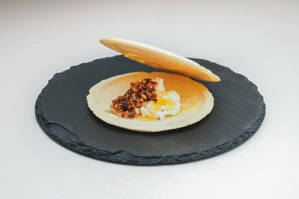 志賀煎餅の「うす焼きチーズせんべい」でかつおおかかナッツ・カッテージチーズ・蜂蜜を挟みました。かつおおかかナッツの旨みとチーズのやさしい口当たりに蜂蜜の甘味が加わり、和と洋が重なり合う新感覚の味わいをぜひお楽しみください。