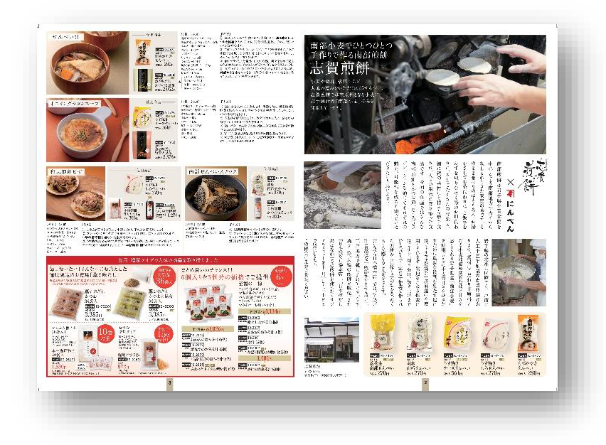 年に5 回発刊される通販カタログでは、この冊子でしか読めない「鰹節」や「だし」にまつわる特集を掲載しています。今回は、にんべん社員が実際に志賀煎餅を訪問し、製造現場の裏側や職人の想いを取材しました。ぜひ、にんべん 日本橋本店にお越しいただき、『だし生活』をご用命ください。※数に限りがございますので、配布が終了した際はご容赦ください。