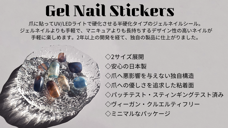 爪と環境に悪影響を与えないよう2年以上に及ぶ共同研究によって商品開発し、2024年11月に発売開始した、ENCHANT。性別年齢を問わないデザインで、独自構造とネイルケア成分配合で爪に対してのやさしさにこだわりぬいたGel Nail Stickers(半硬化ジェルネイルシール)を中心に、ネイル商品を展開しております。