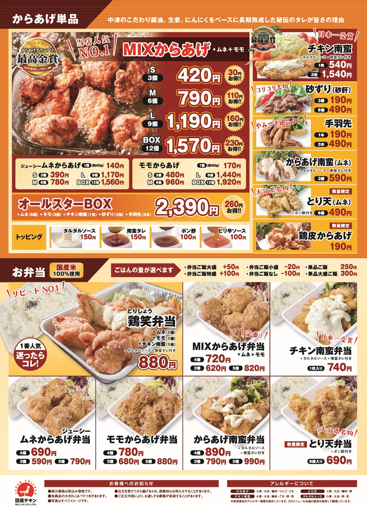 「鶏笑」は、日本、海外に店舗展開するからあげ専門店で、からあげの聖地である大分県中津の本場唐揚げを販売しています。からあげグランプリでは、しょうゆ唐揚げ部門とチキン南蛮部門の2部門で最高金賞を受賞し、しょうゆ唐揚げ部門では14年連続で金賞を受賞しています。